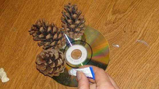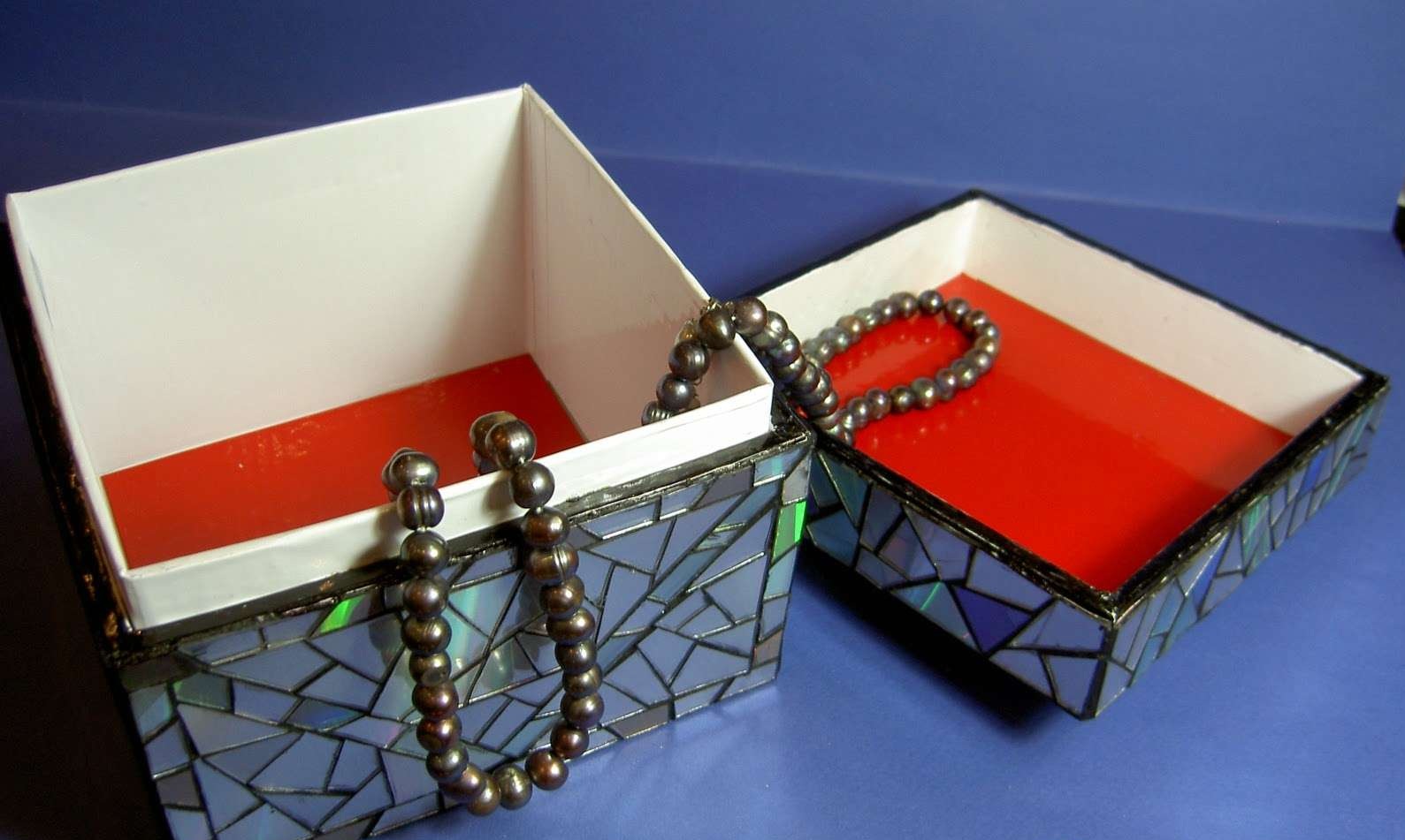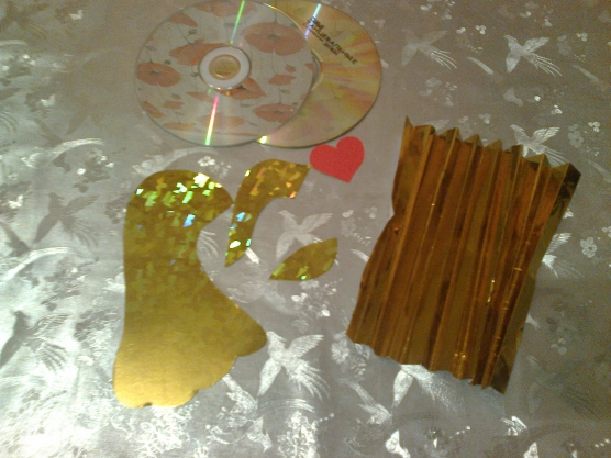 Quando a caixa estiver completamente acabada com o tecido, prossiga para o próximo passo. Nós cortamos os discos compactos com uma tesoura, em pedaços grandes e pequenos. Cole-os com cola para a nossa futura caixa.