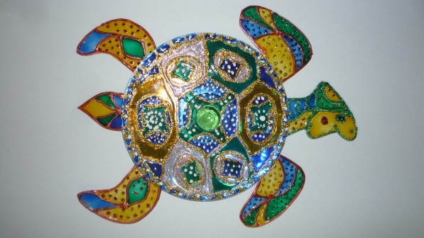 - Vamos dar uma volta - esta é a futura carapaça de uma tartaruga. Para começar, desenhe uma concha usando um contorno decorativo em um círculo. Em seguida, desenhe o contorno dos fragmentos de vitrais em torno de toda a circunferência da casca.