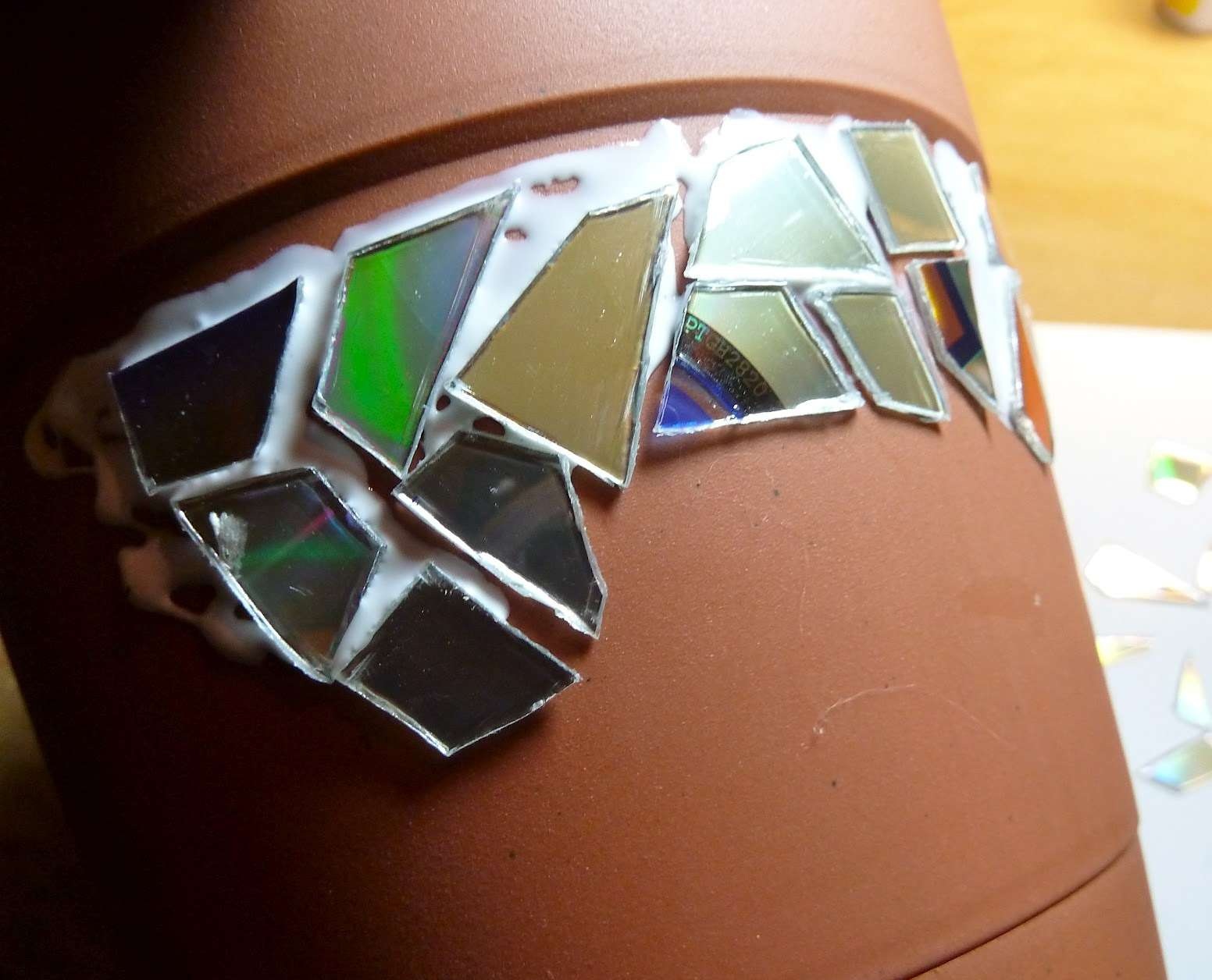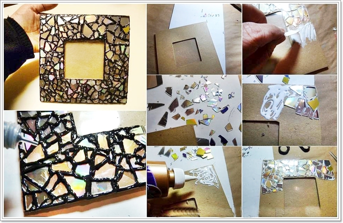 - Corte os discos com uma tesoura em pedaços de diferentes formas e tamanhos. Cole-os na armação, depois de prendê-los à superfície e estimar como eles vão ficar. Se desejar, usamos uma escova fina para passar pelas rachaduras, rachaduras entre os fragmentos, pintando-os com guache branco.