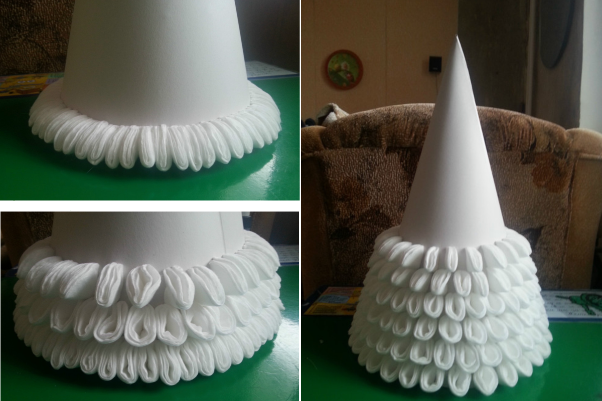 Instalamos um cone no centro do espaço de trabalho e começamos a produzir roupas para a árvore de Natal. Para fazer isso, dobre a almofada de algodão ao meio, depois dobre na forma de um cone, conectando as extremidades afiadas entre si. Nós fixamos a base do cone de algodão com um grampeador.