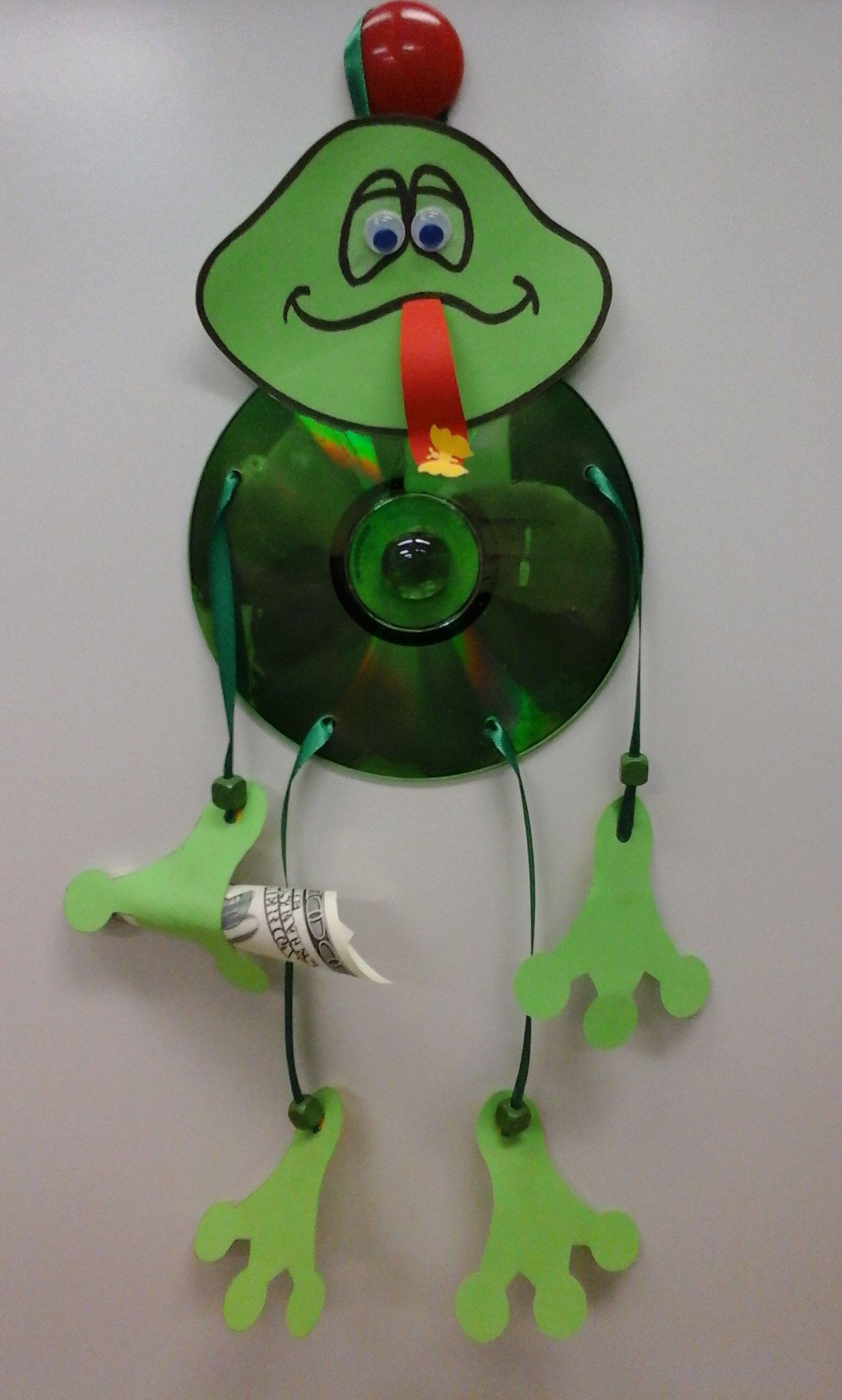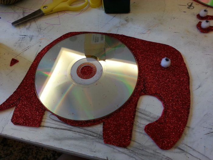 Corte um pequeno círculo de feltro, pinte-o com um marcador preto - este será um olho de elefante. Aperte o olho com uma pistola de cola para a silhueta de um elefante. Para o centro do elefante cole o CD. Fique pronto.