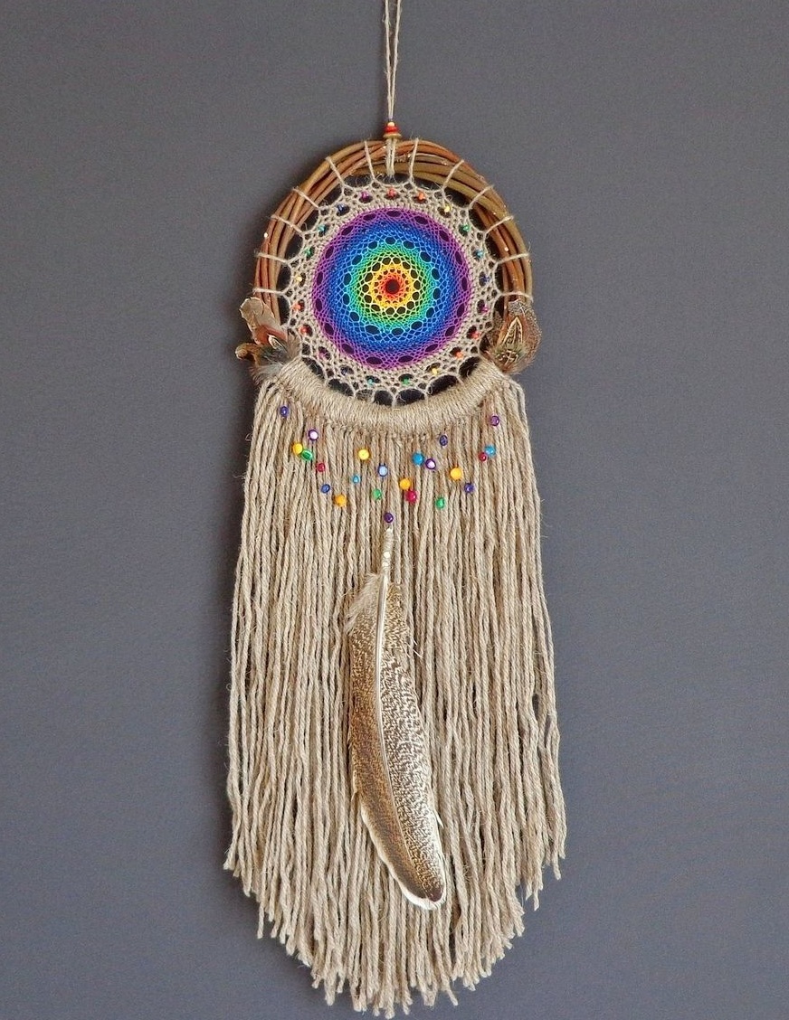 - Apanhador de sonhos - aros de bordar e fios de lã são usados aqui. Com um enrolamento adequado, usando cores diferentes dos fios, você pode recriar um apanhador de sonhos ou apenas uma embarcação para a criança - o sol, o coração, a fruta no corte e assim por diante.