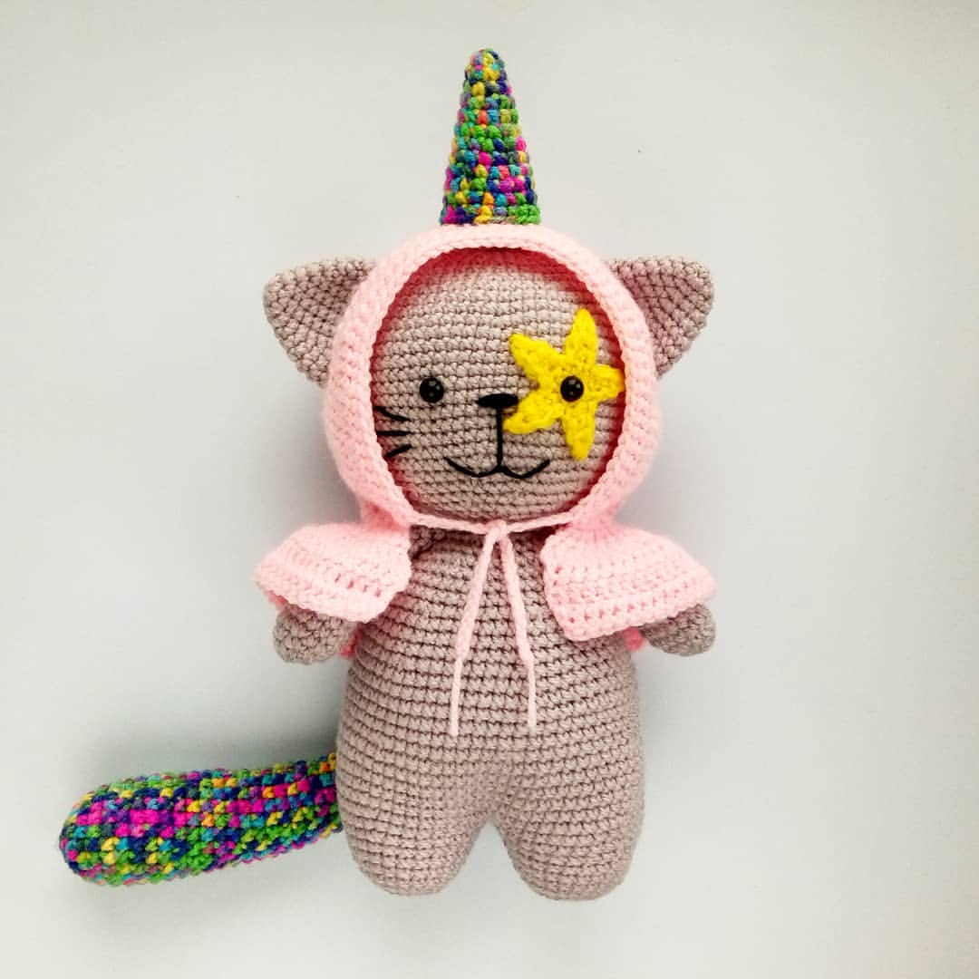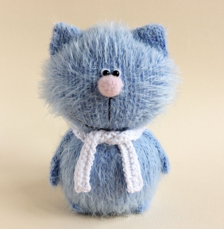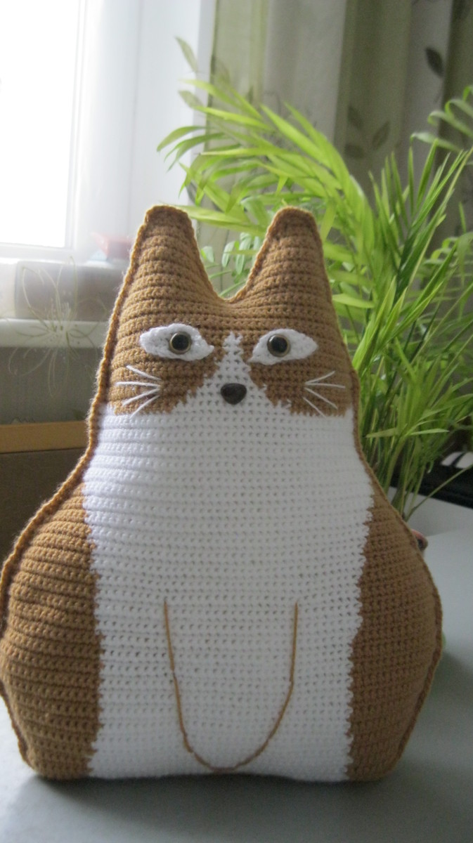 - Tricô-travesseiros de tricô. Muitas vezes, são travesseiros padrão, conectados por um rosto ou lenço, com subsequente decoração. Por exemplo, se os gatos são formados, é necessário amarrar um quadrado ou um retângulo, preenchê-lo com algodão e outras variedades de enchimento, e no final bordar um bigode no "focinho", amarrar dois cantos, formando orelhas.