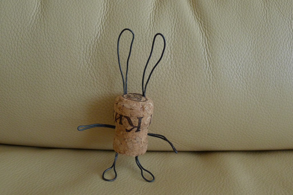 - Em seguida, o fio é inserido nos locais apropriados da cortiça - na parte inferior dois para as pernas, nos dois lados e o mesmo na parte superior para as orelhas. Os laços quando dobrados permanecem do lado de fora.