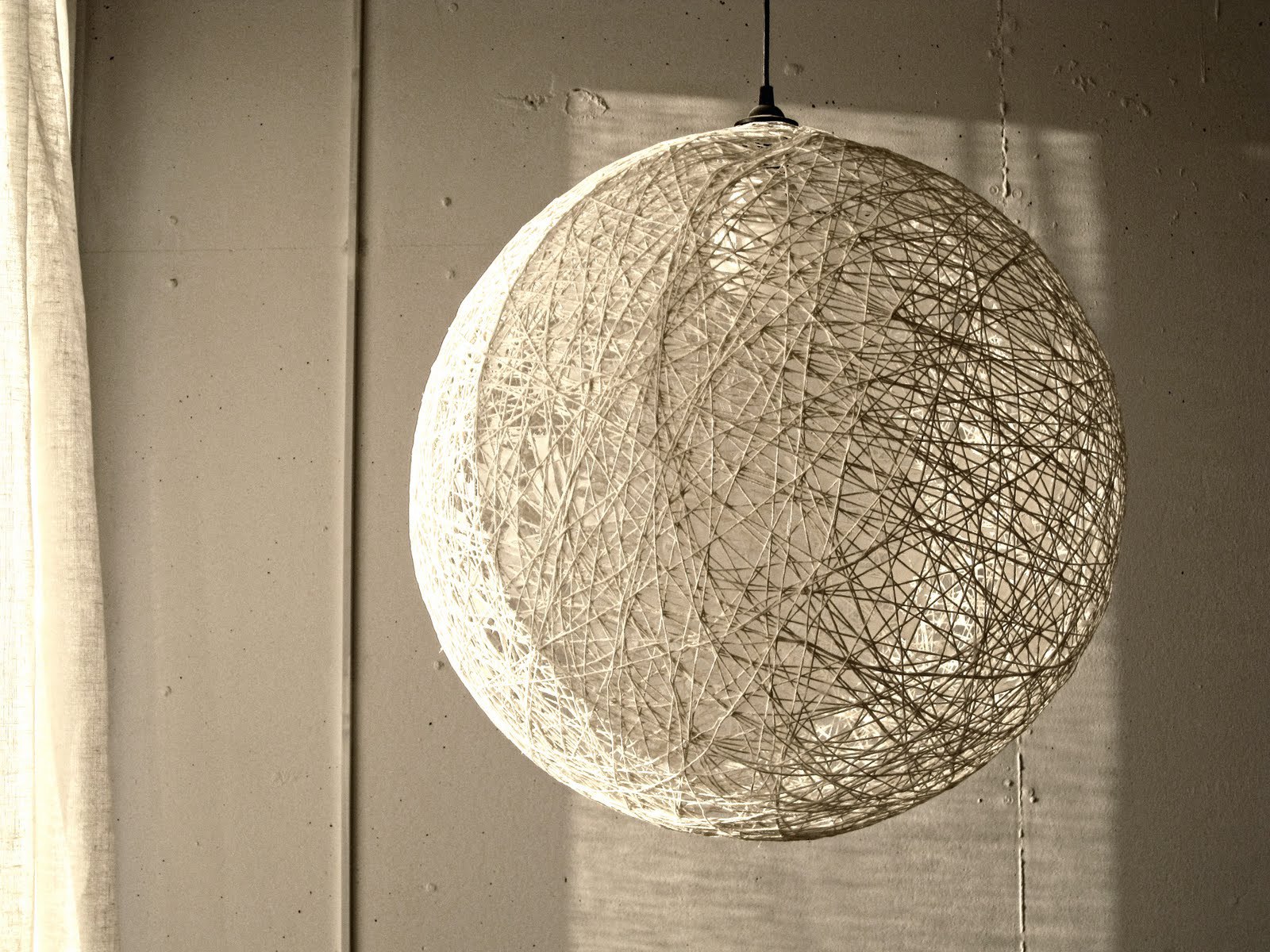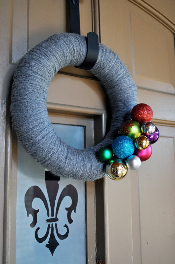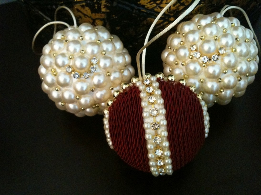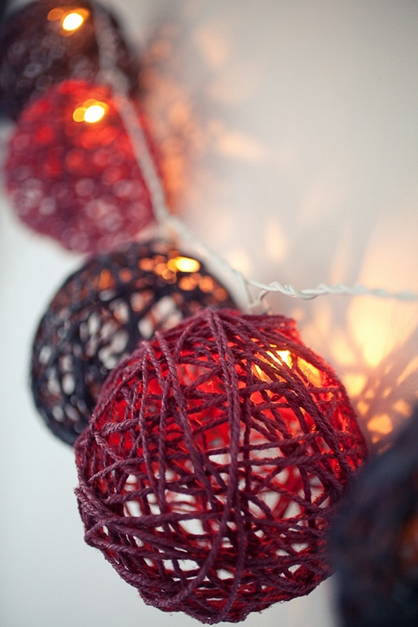 - Bola "apertada" na árvore de Natal - para fazer isso, você precisa pegar uma bola padrão para a árvore de Natal (é melhor se ela for polvilhada com lantejoulas ou ter uma superfície em relevo) e envolvê-la com cola e linha. Tanto o fio de melange como o monofónico com contas ou contas encordoadas serão adequados para decoração.