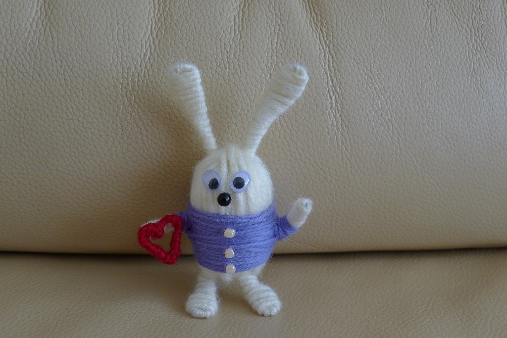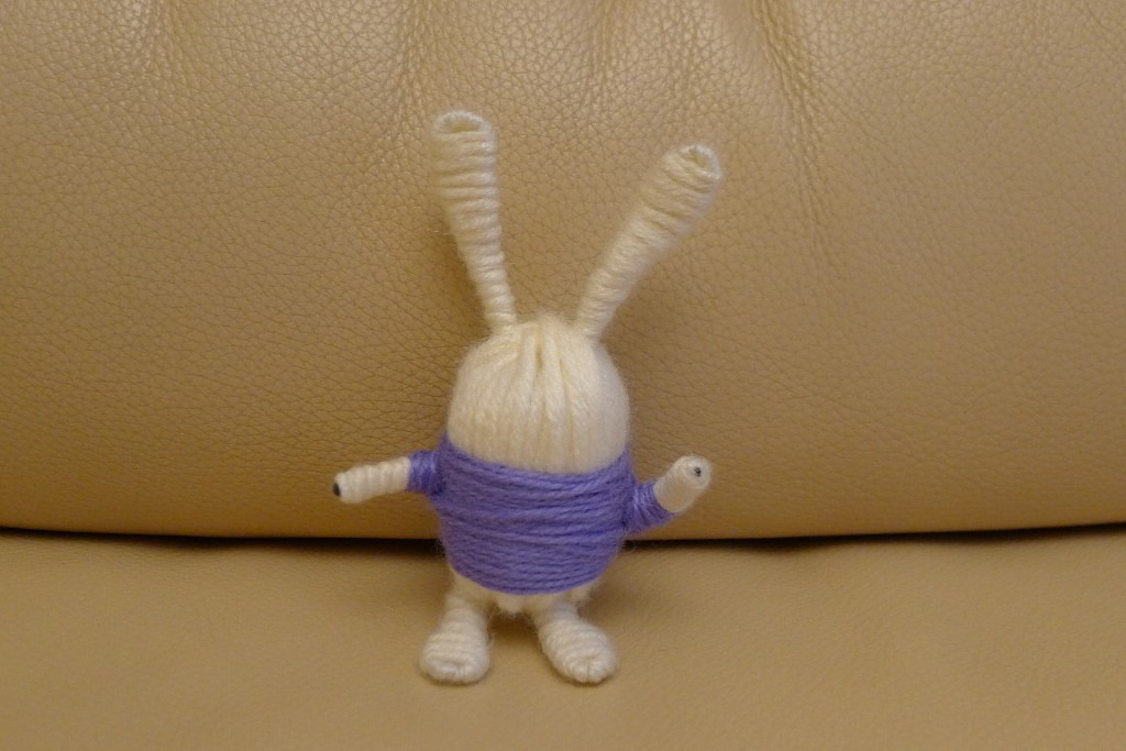 - O quadro para o coelho está pronto. Então, usando um fio e cola, eles formam um brinquedo, enrolando todas as partes separadamente - primeiro elas envolvem as partes dos fios e depois vão para a rolha.