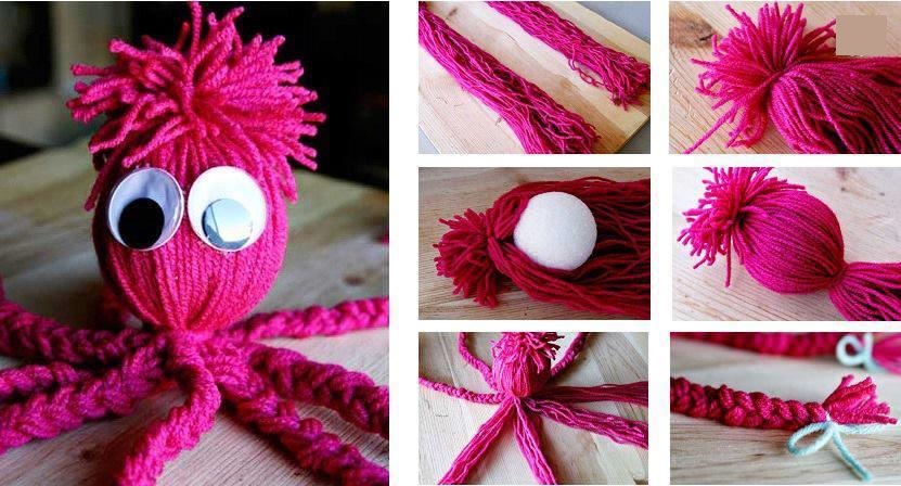 Brinquedos com as próprias mãos são sempre cuidadosamente armazenados e usados por crianças, para que a criança possa ser oferecida para fazer seu próprio polvo a partir de fios. Para a fabricação você precisará de um fio de lã ou acrílico de cor brilhante e tesoura.