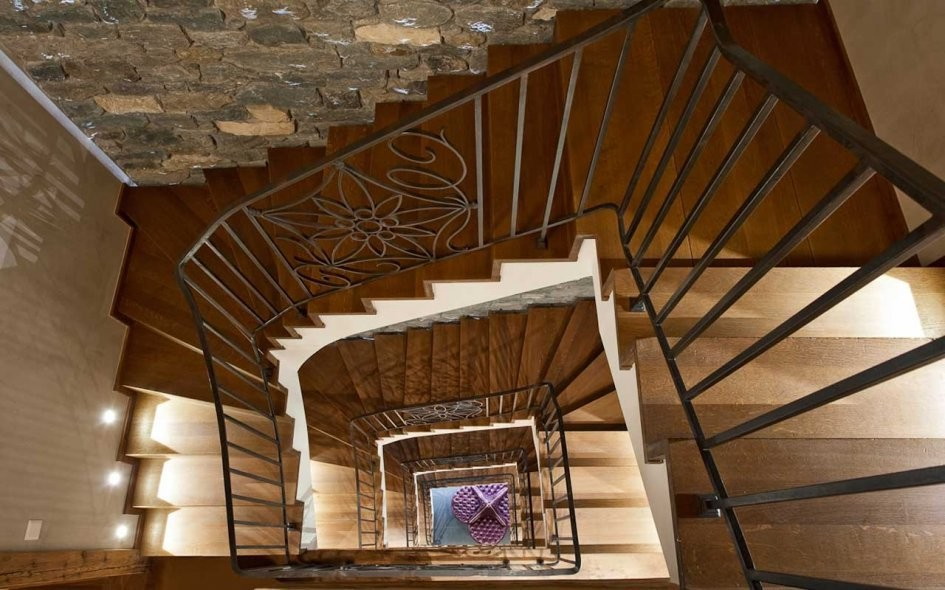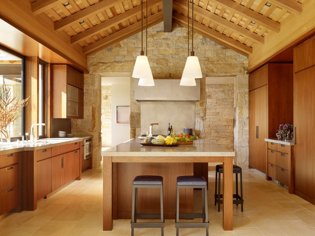 A decoração interior é composta por materiais naturais, acabamentos com uma paleta natural. A combinação de madeira e pedra é mais adequada para a construção, decorando belas casas com um ambiente acolhedor e relaxante.