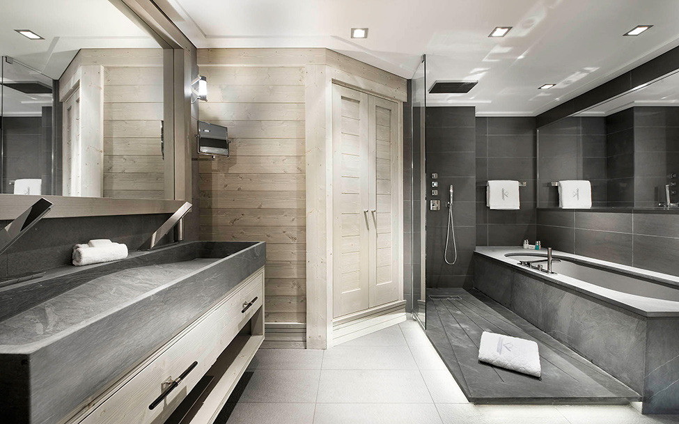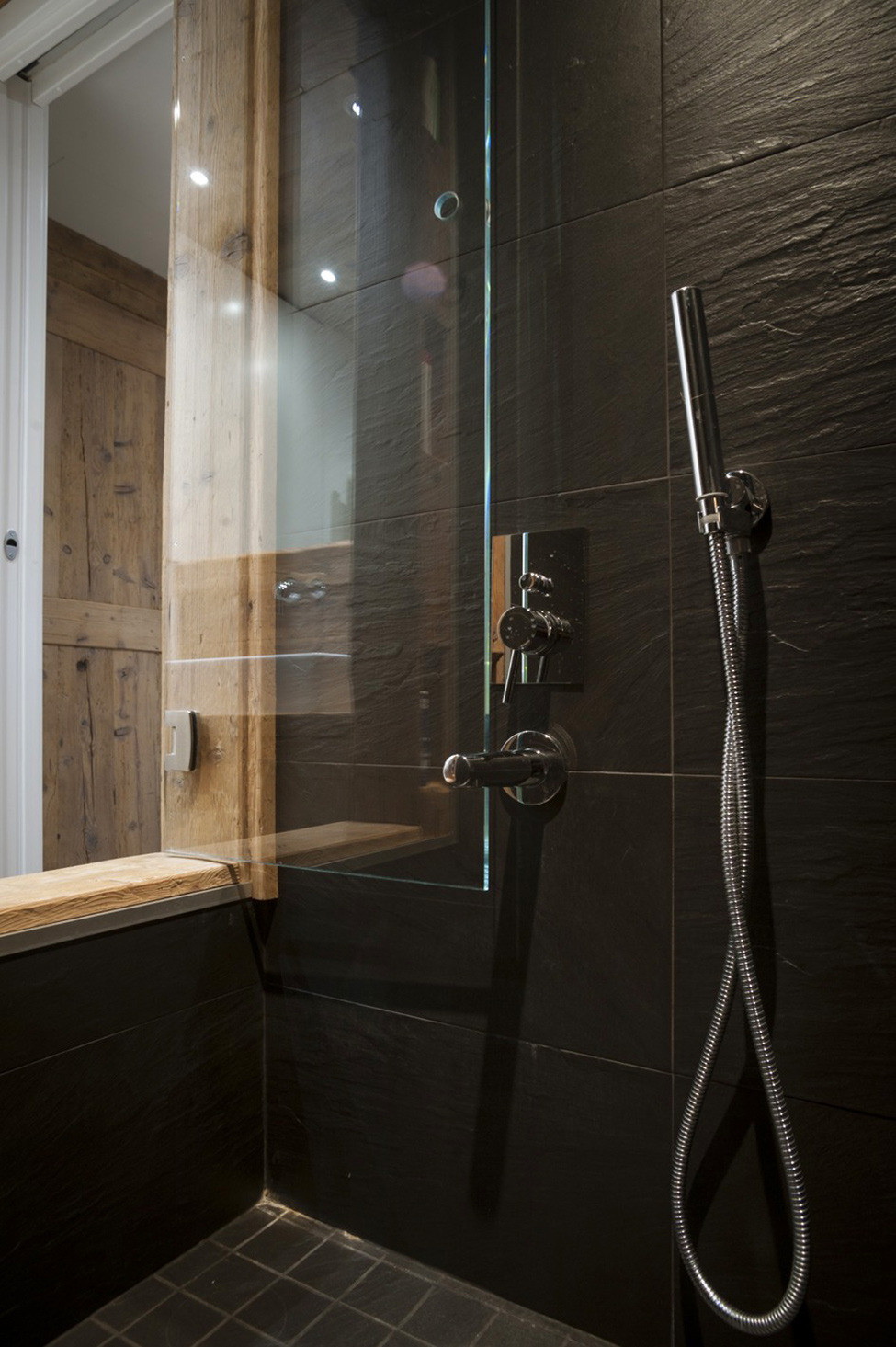 Um banho de estilo chalé é um refúgio no abrigo. “Para um relaxamento completo, tome um grande banho, mantenha uma paleta suave, assegure-se de que o quarto tenha uma boa luz, acesso à rua”, escreve Bingham. Banho, totalmente forrado com madeira, irá determinar o humor principal, lembrar sobre a beleza ao redor.
