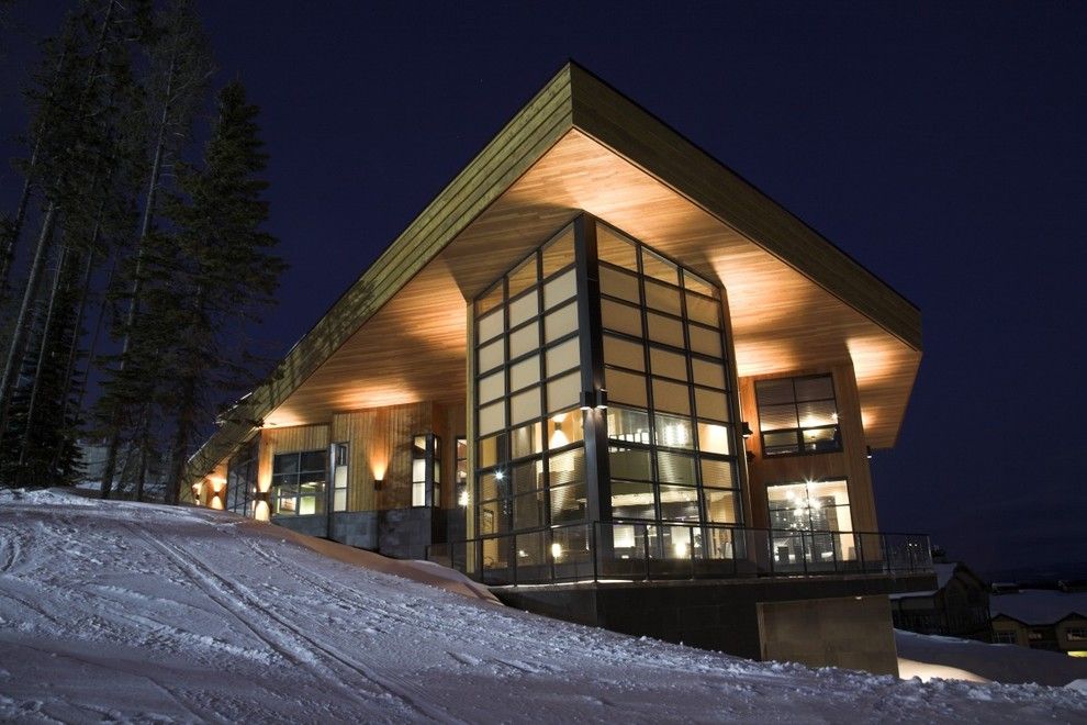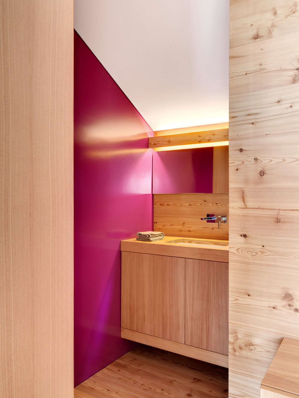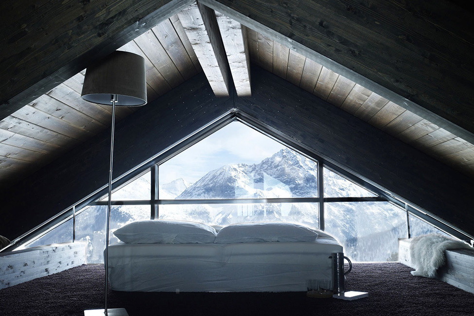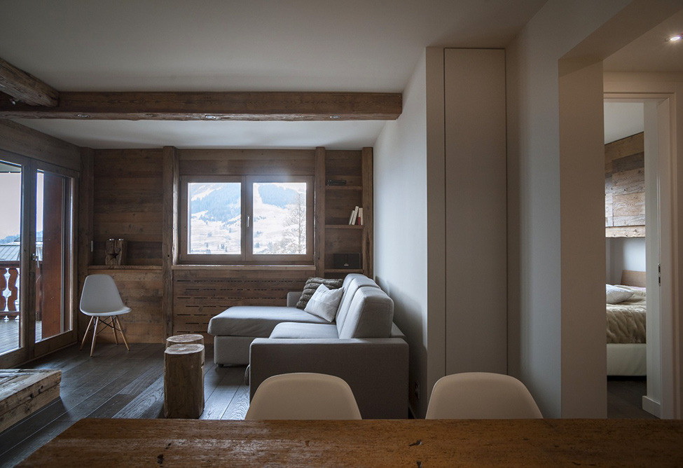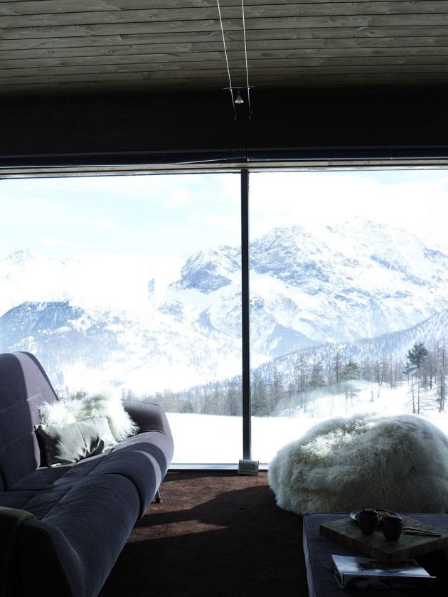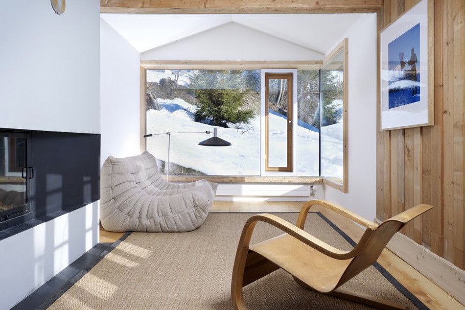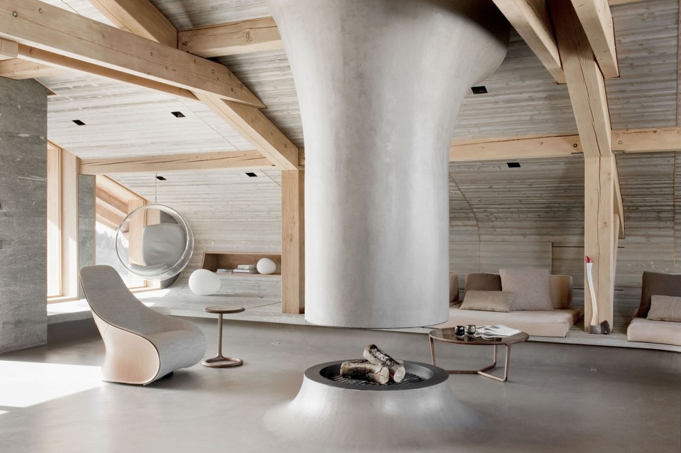O design do chalé é caracterizado por suas fachadas de concreto, que eventualmente penetram para dentro, onde contrastam fortemente com o revestimento de madeira e formam um núcleo interno interconectado, que une as salas principais, embora sejam orientadas para diferentes tipos de vale. Eles são cobertos com detalhes mínimos de madeira para criar um bunker de esqui ascético mas espaçoso.