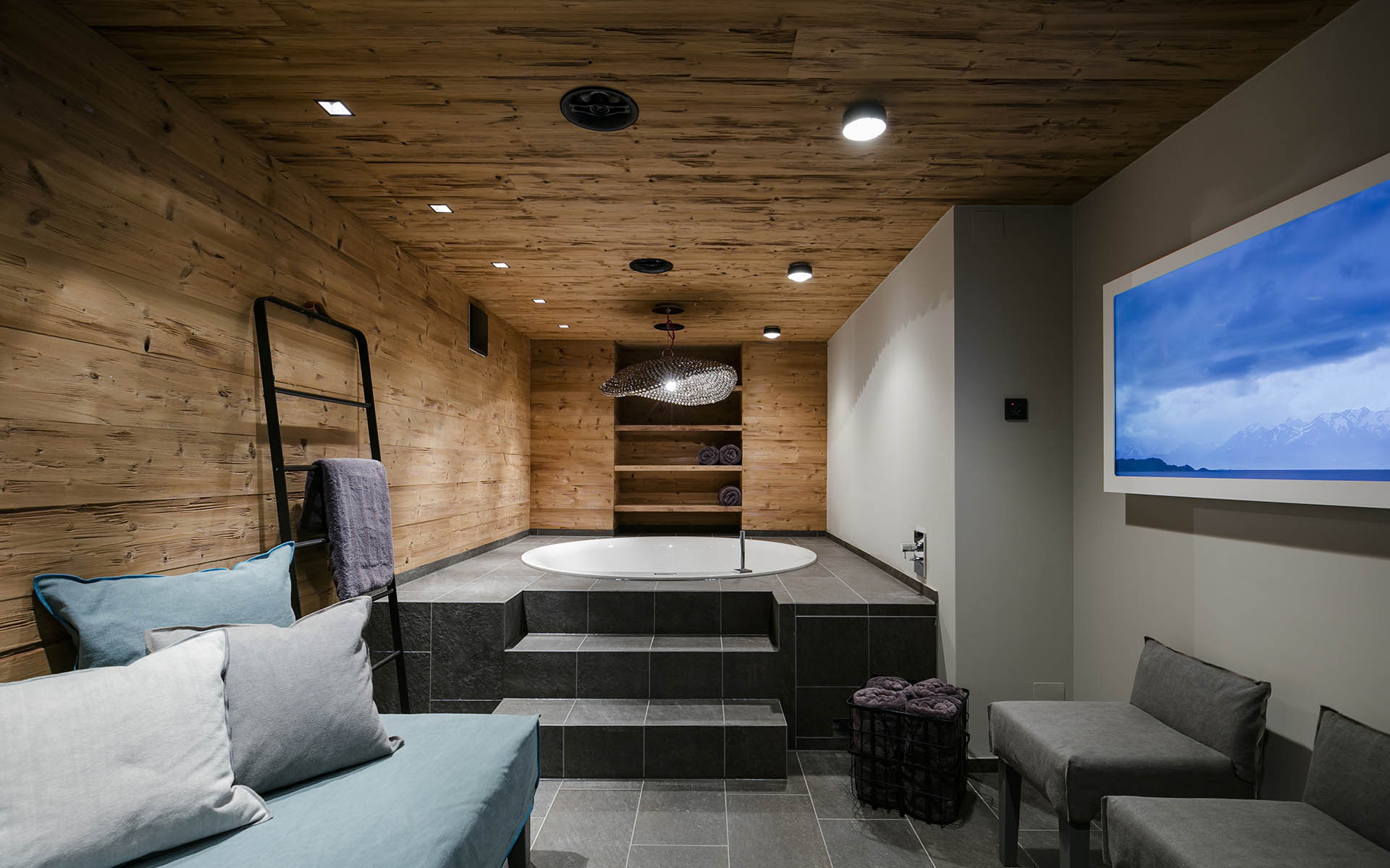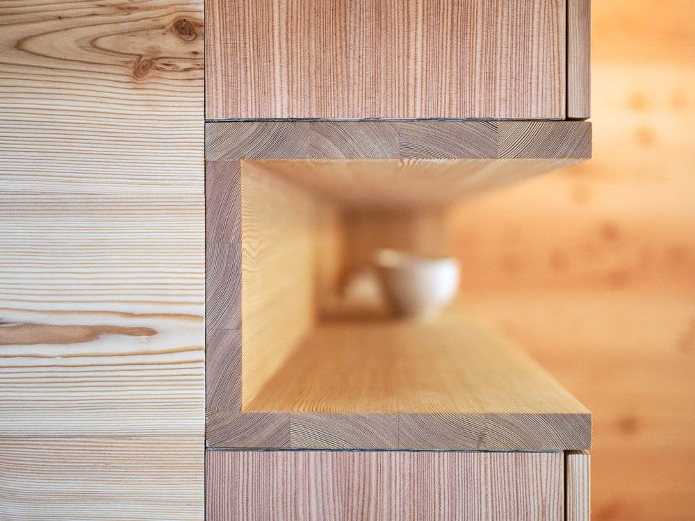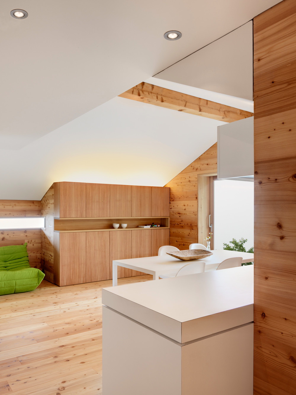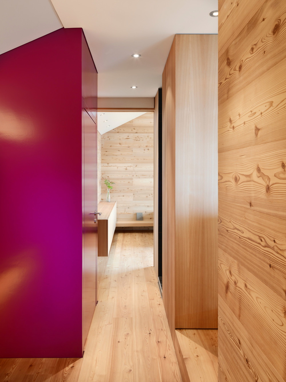 O design do chalé é caracterizado por suas fachadas de concreto, que eventualmente penetram para dentro, onde contrastam fortemente com o revestimento de madeira e formam um núcleo interno interconectado, que une as salas principais, embora sejam orientadas para diferentes tipos de vale. Eles são cobertos com detalhes mínimos de madeira para criar um bunker de esqui ascético mas espaçoso.
