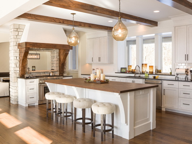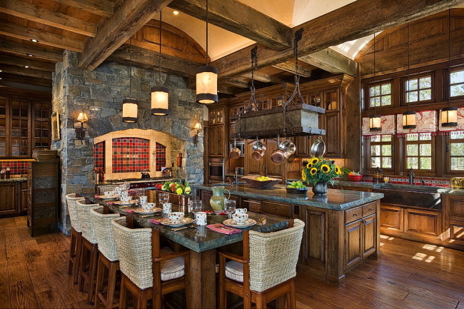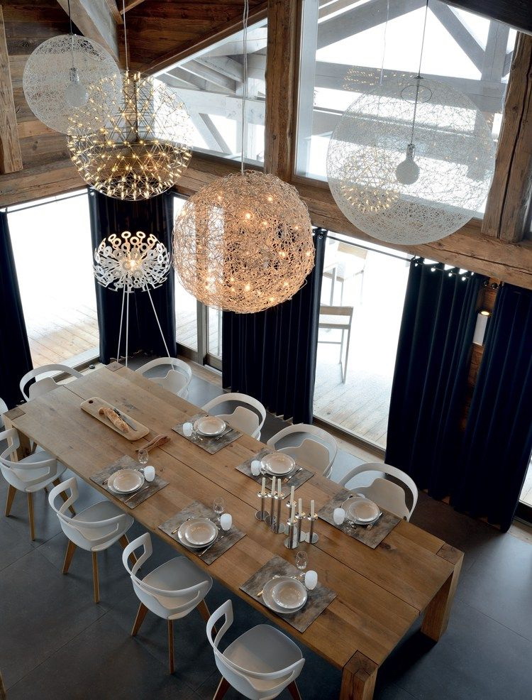 O estilo do chalé sugere que a família e os amigos se reunirão em torno de uma enorme mesa onde você pode conversar confortavelmente. Para isso, é claro, vale a pena decorar a sala de estar com uma grande mesa de madeira.