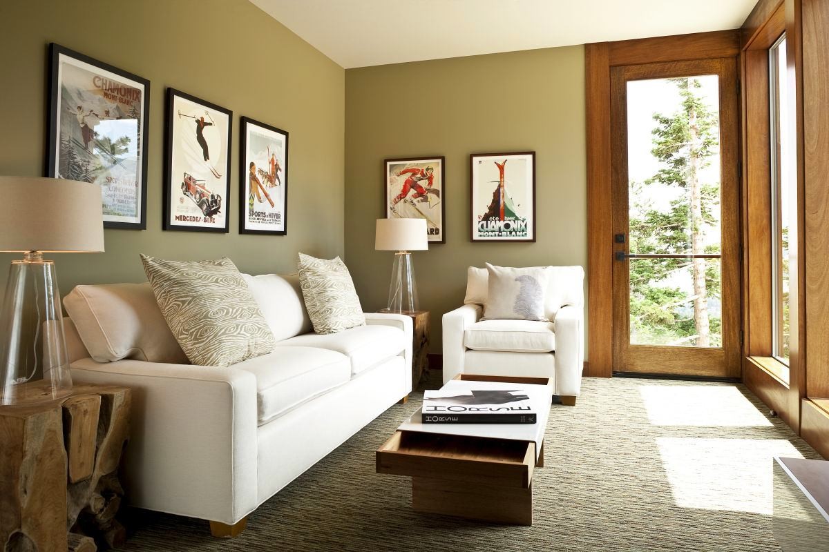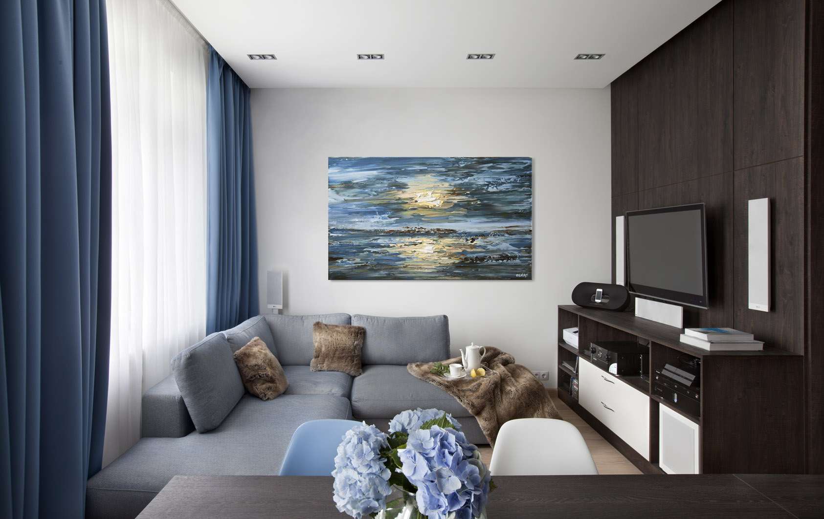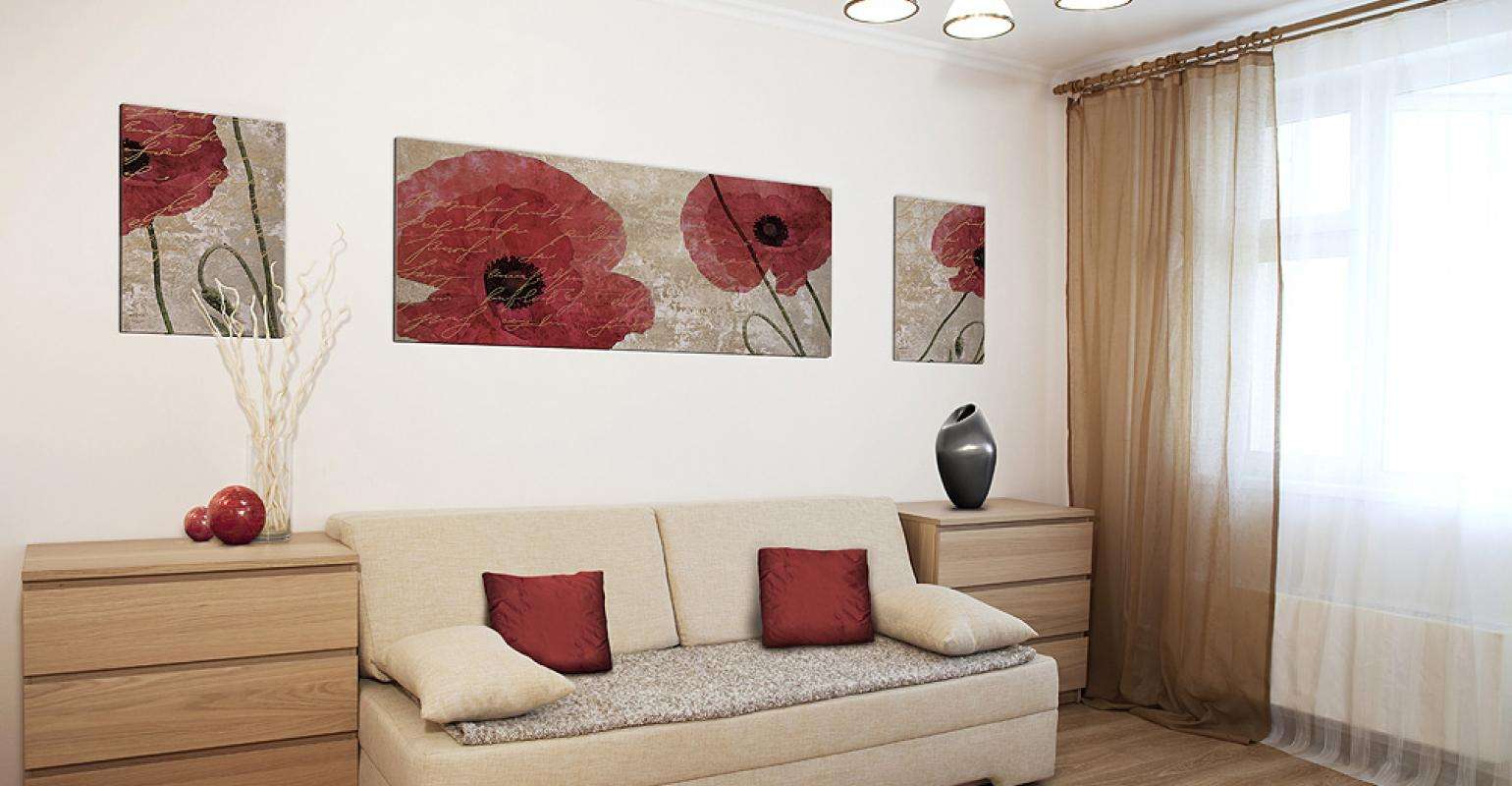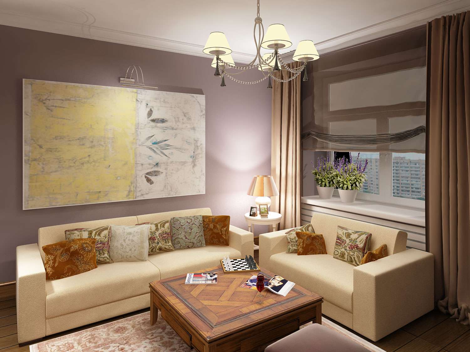 Impressões para a sala de estar devem ser escolhidas pequenas, sem cores chamativas, e com um design conciso. Não é aconselhável introduzir grandes elementos luminosos no interior, não só na decoração das paredes, mas como acessórios. Um grande padrão nas paredes criará a impressão de um pequeno espaço apertado.