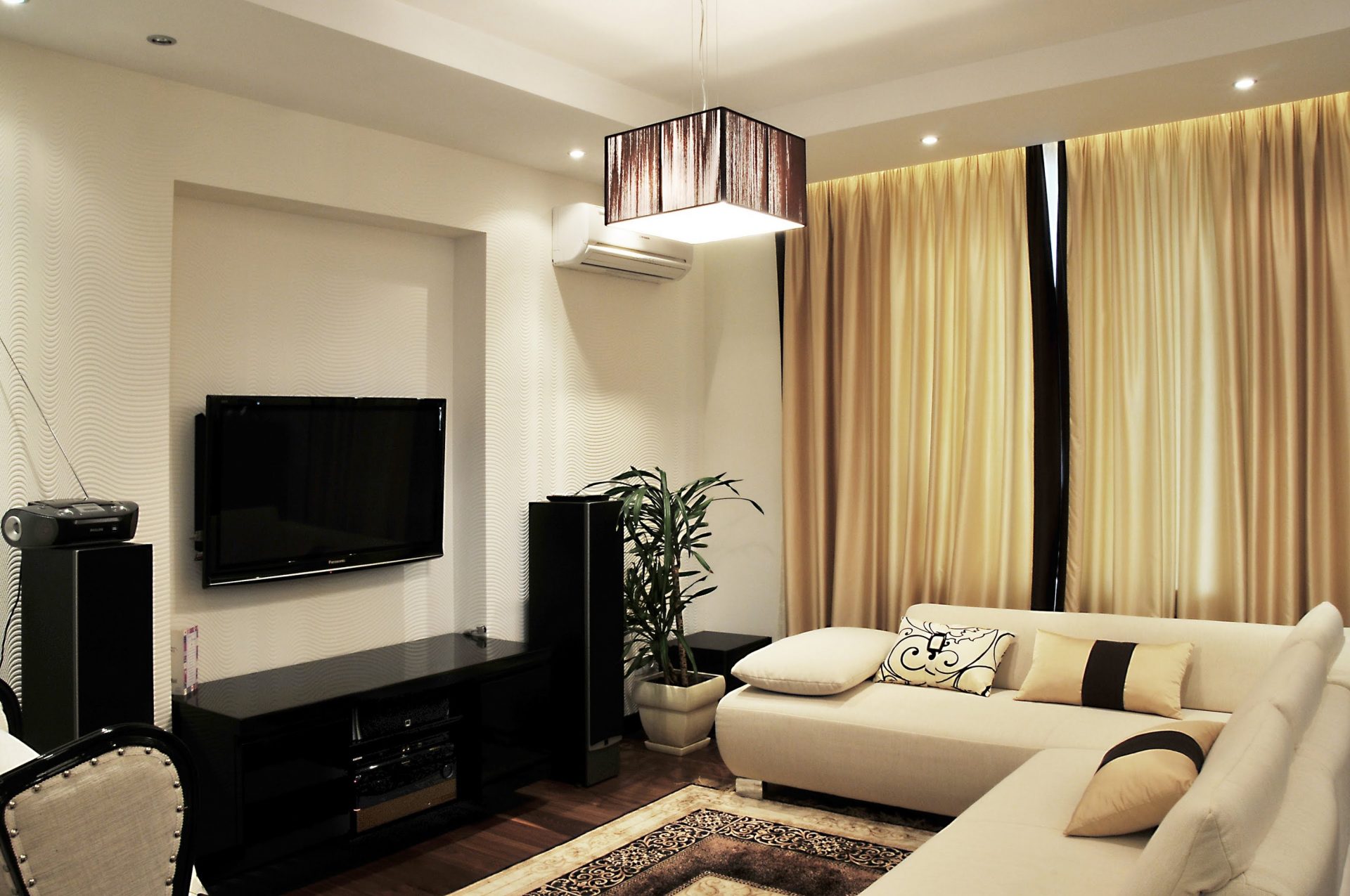 Mesa e armário para a sala de estar deve ser pequena e compacta. Um grande sofá cria conforto, mas pode estar fora de lugar em uma pequena área.