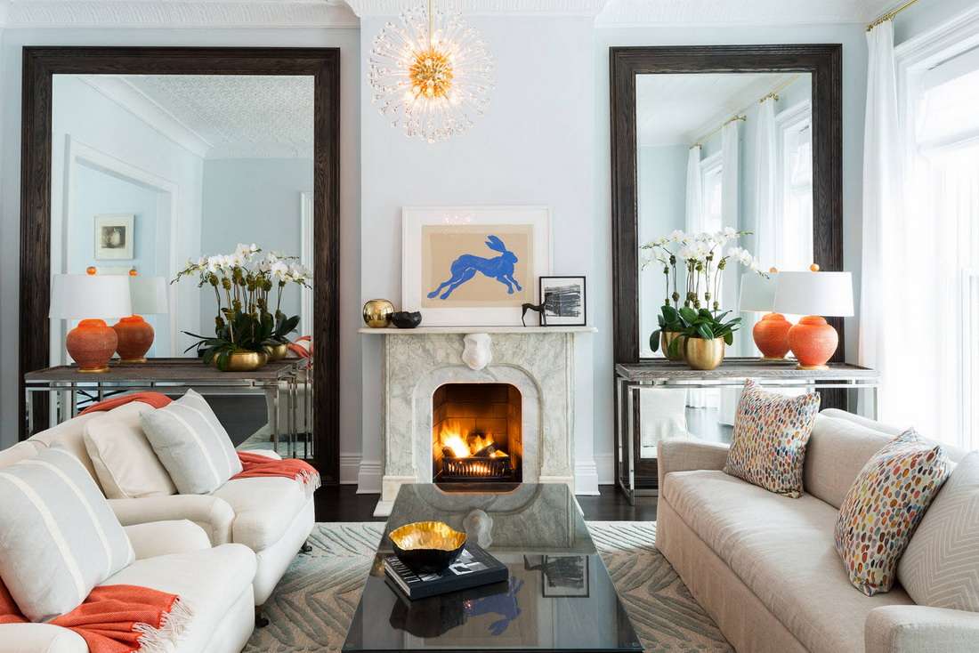 Se você precisa visualmente "empurrar" o espaço da sala de estar, você pode usar espelhos. Eles não devem ser pequenos, mas grandes, permitindo criar o efeito de perspectivas. Como exemplo - o uso de móveis com fachadas espelhadas ou colocando uma superfície espelhada sobre sofá.