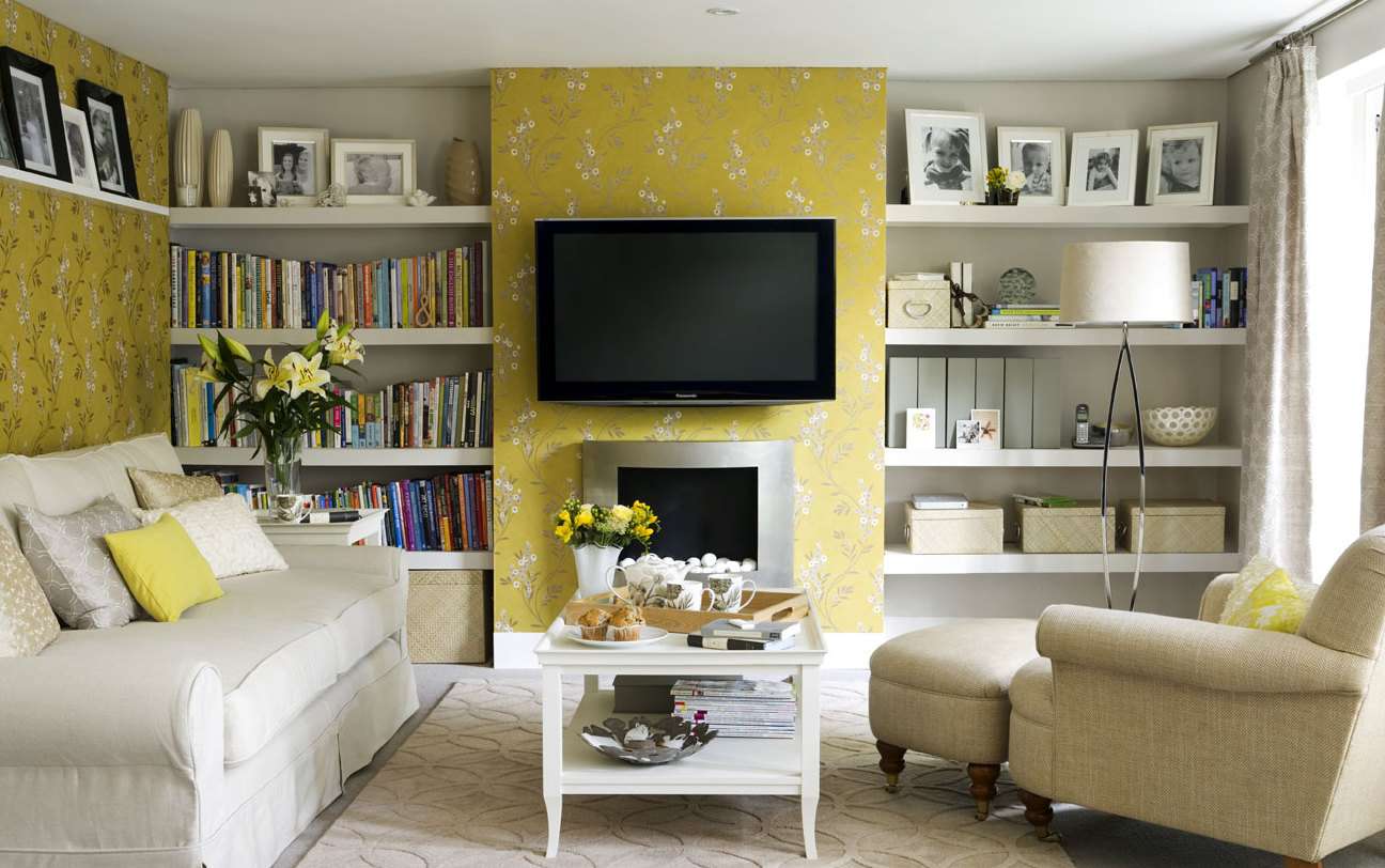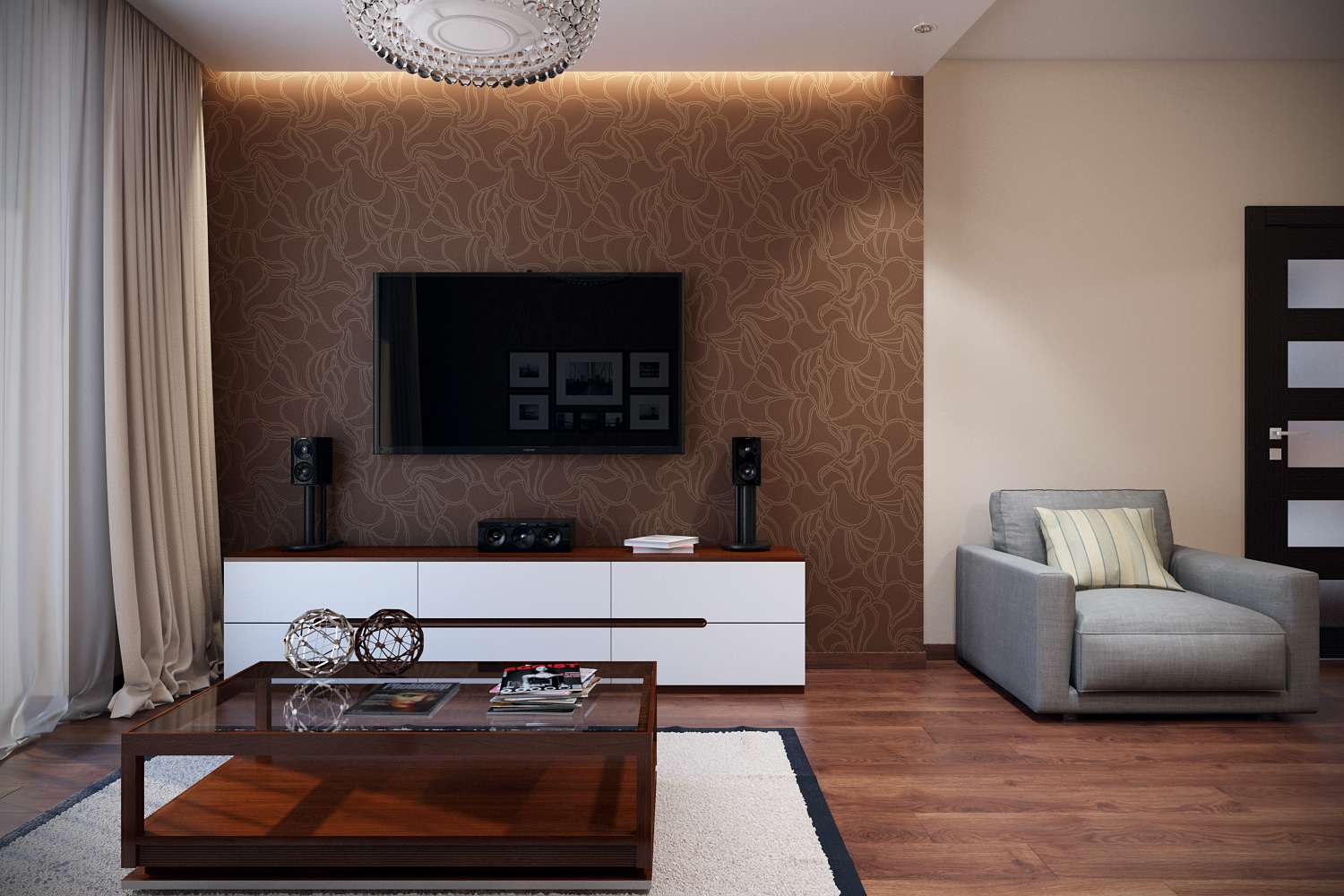 Seleção de uma das paredes da sala de estar na área de lazer com uma cor brilhante ou um padrão cativante de papel de parede da foto vai ajudar a dar o dinamismo da sala. Perto desta parede você pode colocar os itens originais de design decorativo.