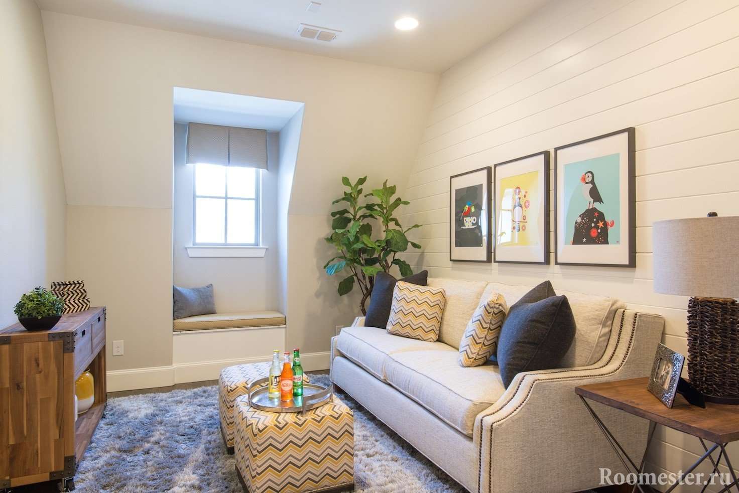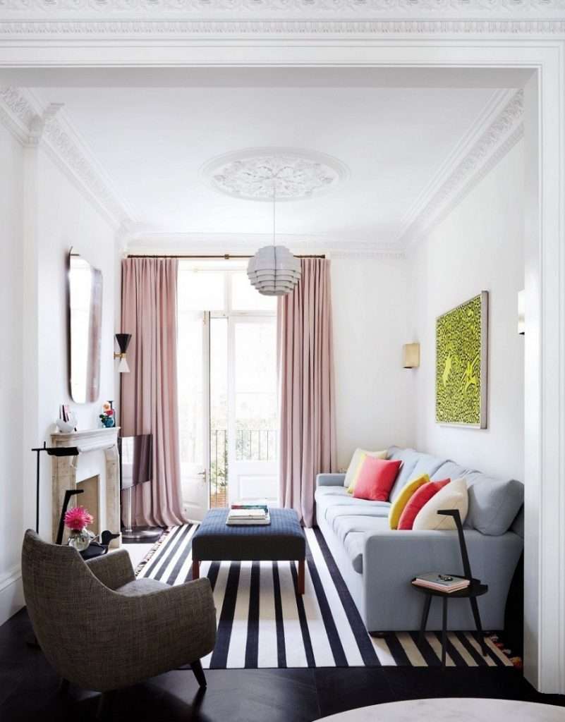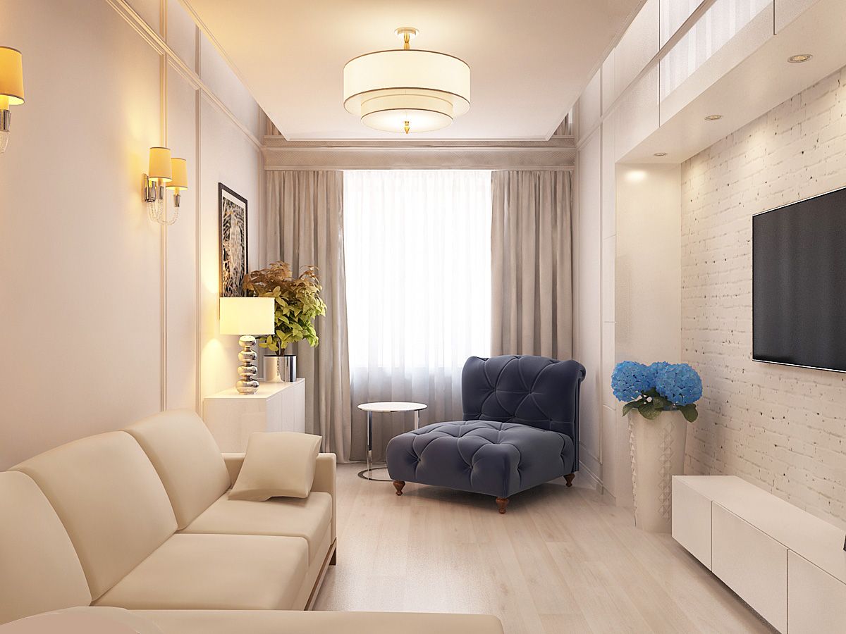 O uso de técnicas de design permite a correção visual da sala. Uma das ilusões de ótica - a escolha de móveis de pequeno tamanho.