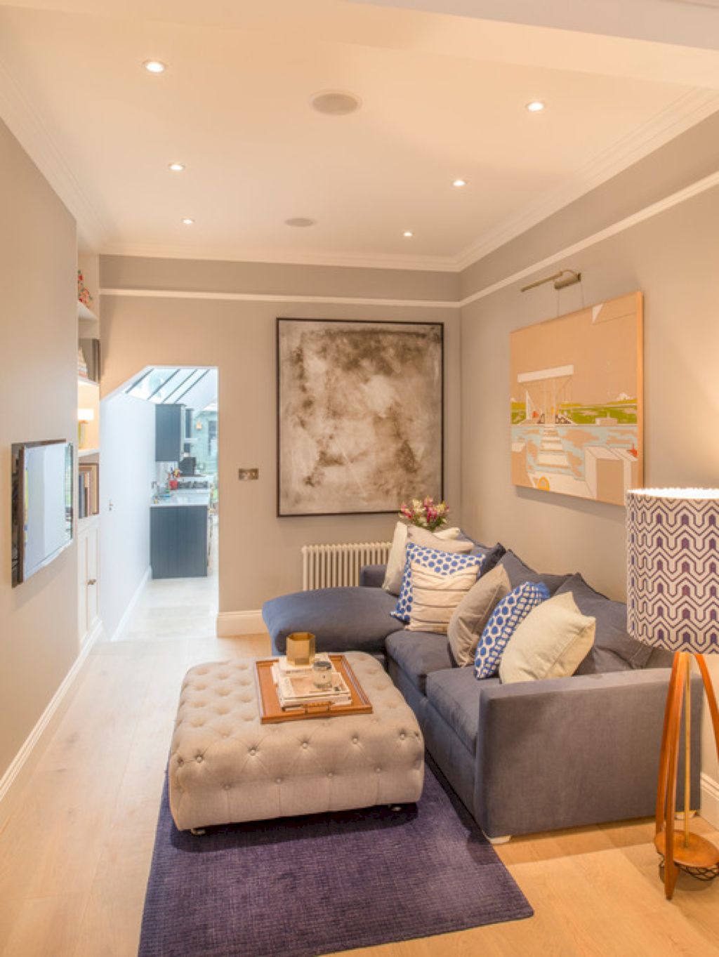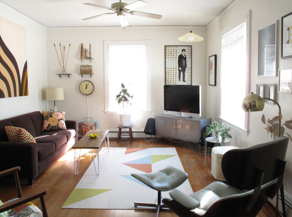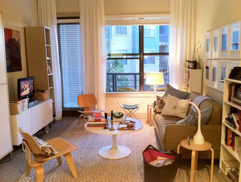 Se houver a oportunidade de abandonar o tapete em uma pequena sala de estar, é melhor fazê-lo. Carpete no chão pode esmagar o espaço e criar a impressão de desordem.