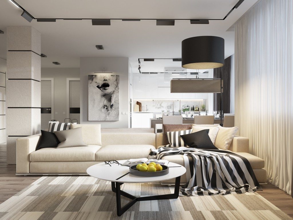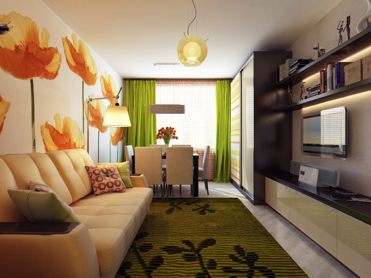 Se a sala de estar é combinada com a cozinha, então você deve considerar cuidadosamente a escolha do piso. Talvez o carpete com uma longa soneca neste caso tenha que ser removido, deixando o laminado ou linóleo na área da sala aberta.