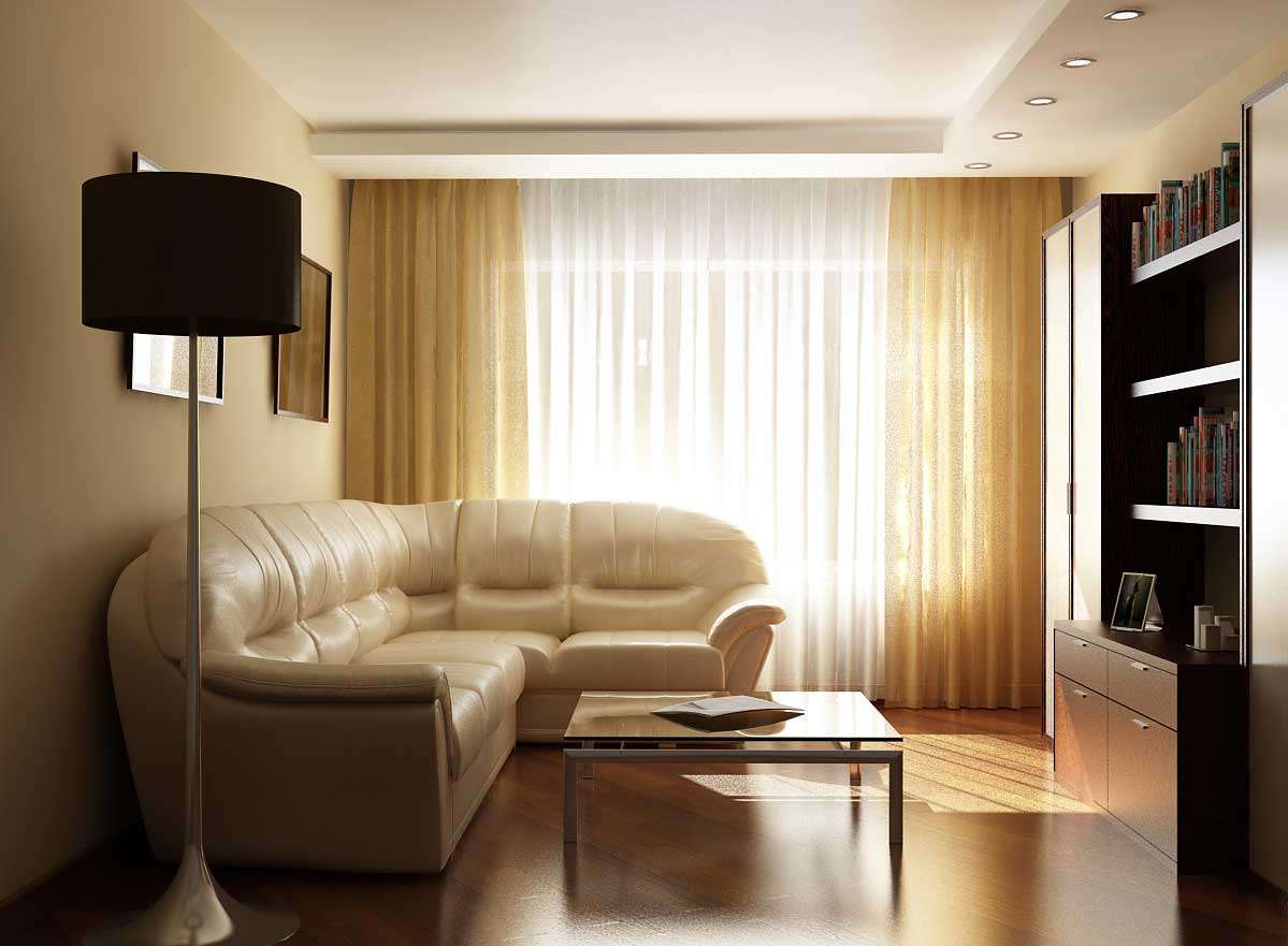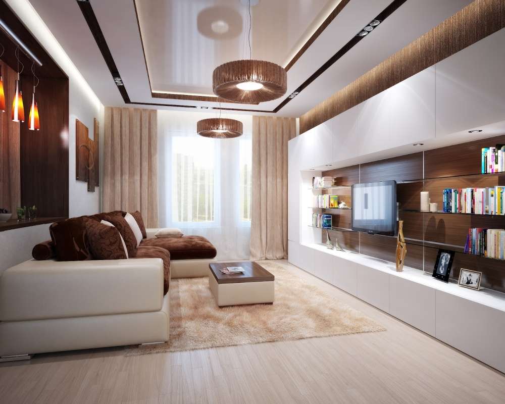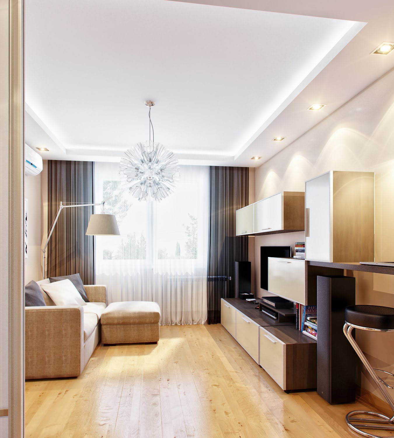 Se o espaço da sala de estar não é apenas pequeno em tamanho, mas também requer a combinação de várias zonas funcionalmente diferentes, então este fator deve ser levado em conta desde o início do projeto. O zoneamento, se necessário, é realizado usando as seguintes técnicas: