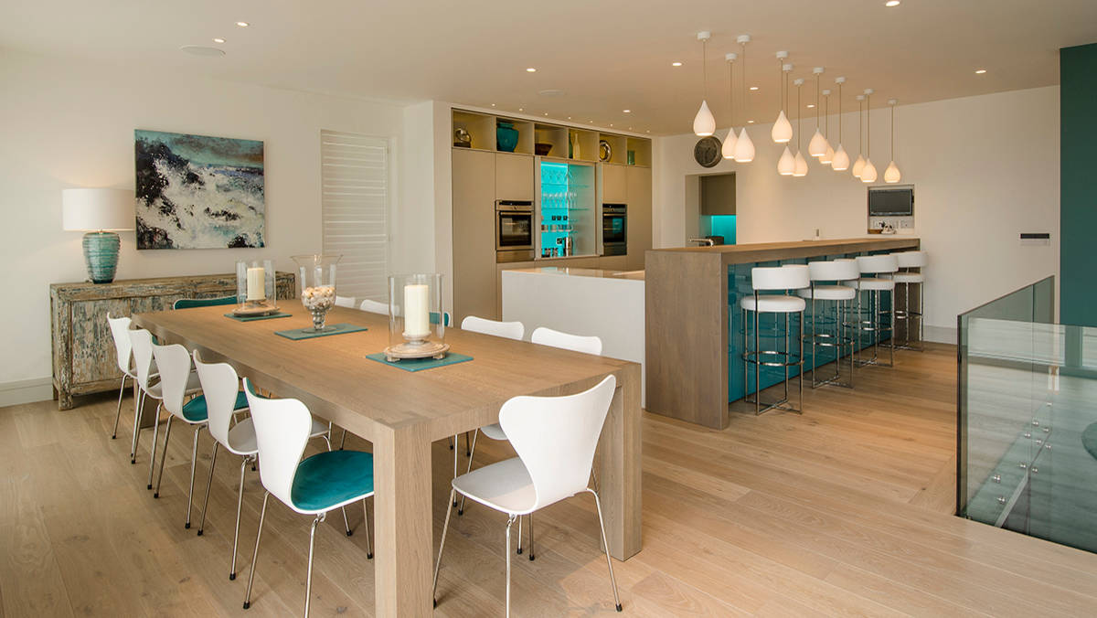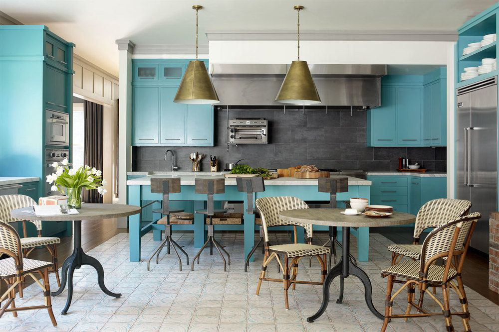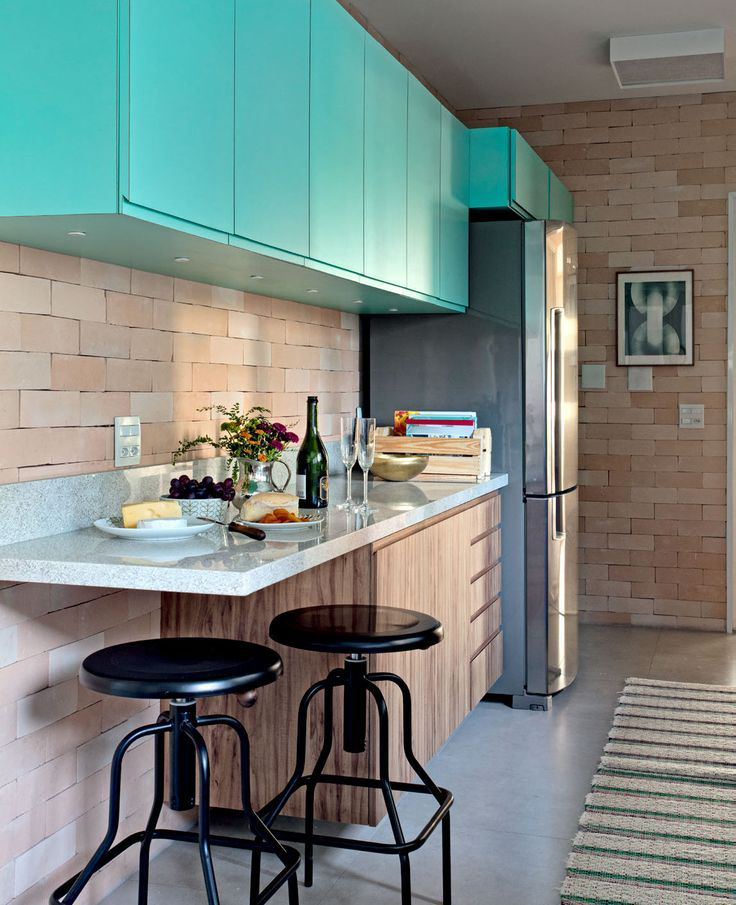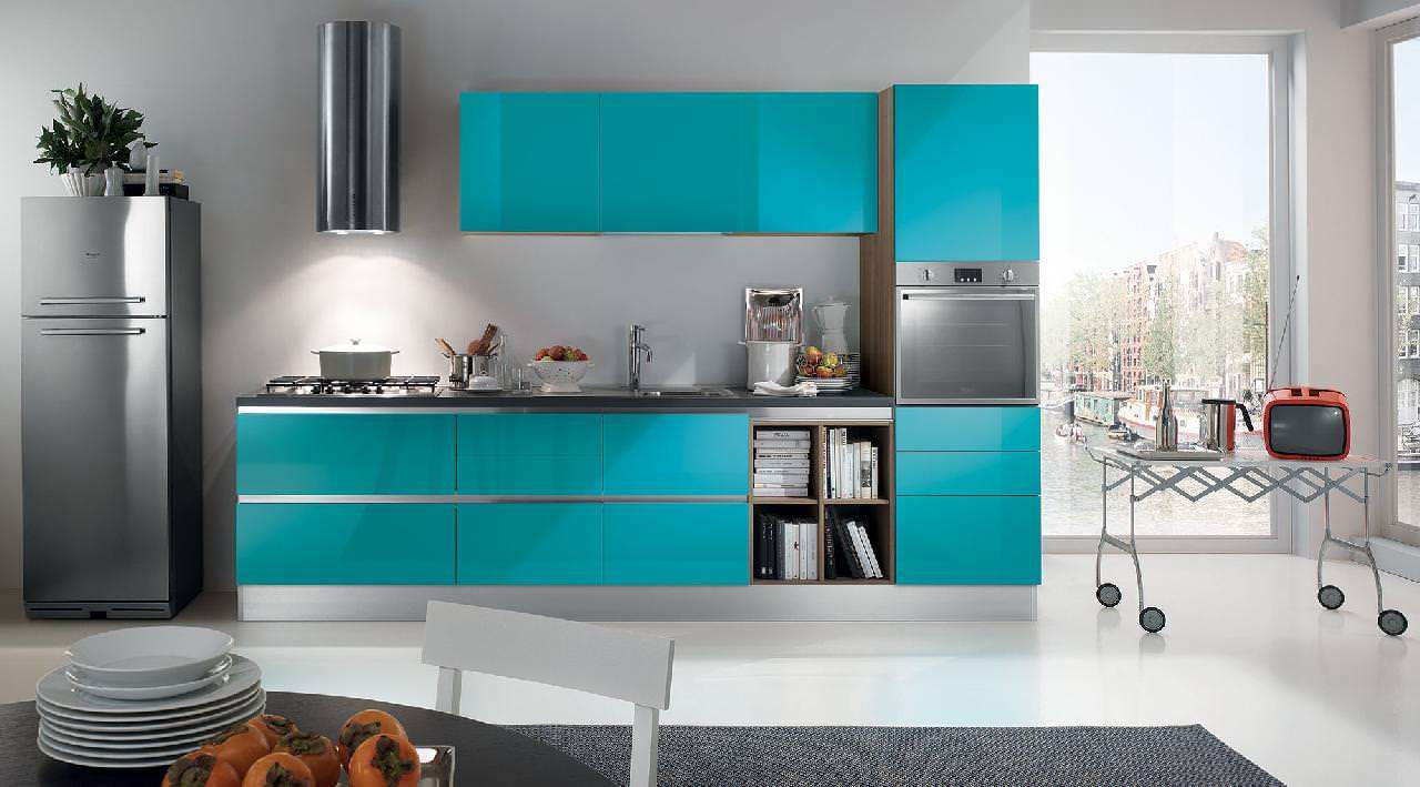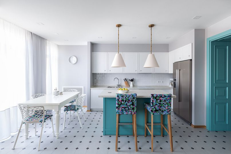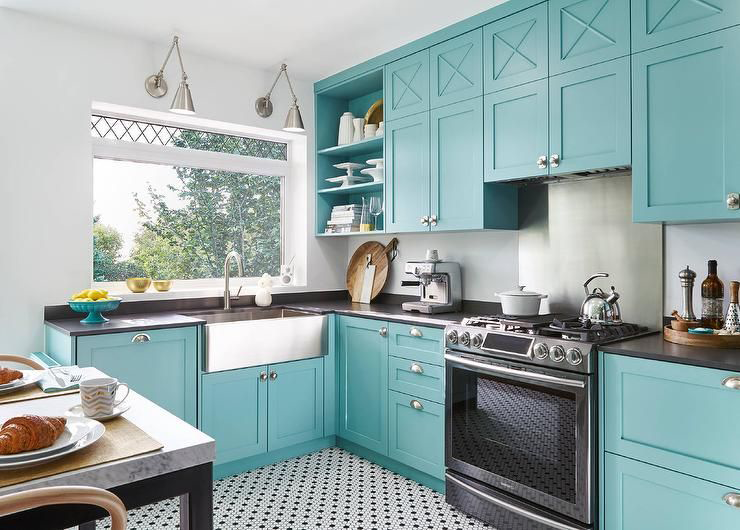 Cor verde-azulada na cozinha de qualquer estilo parece fresco e original: