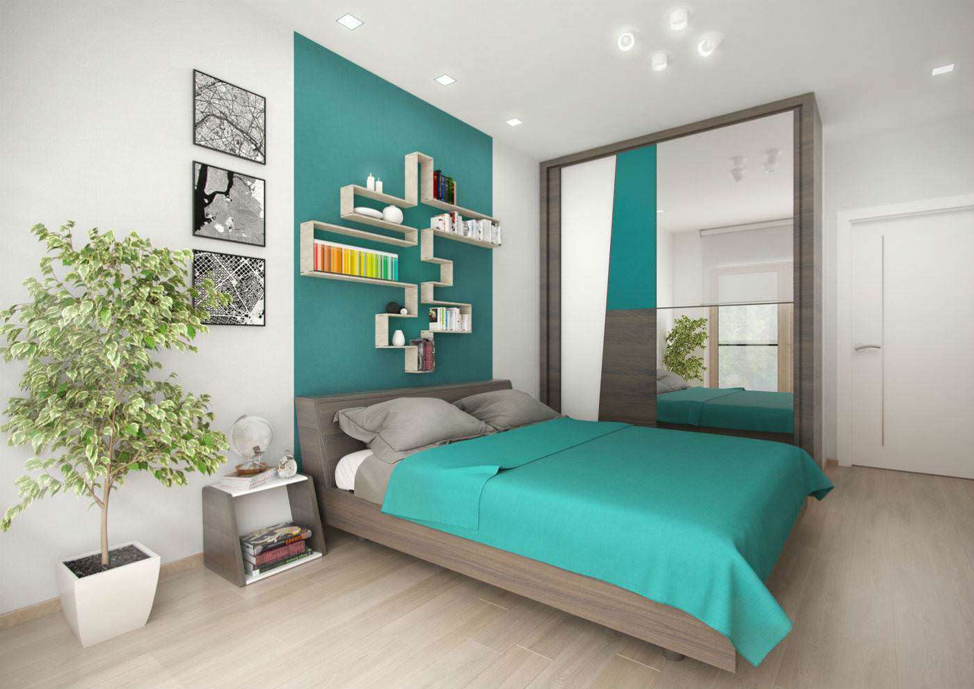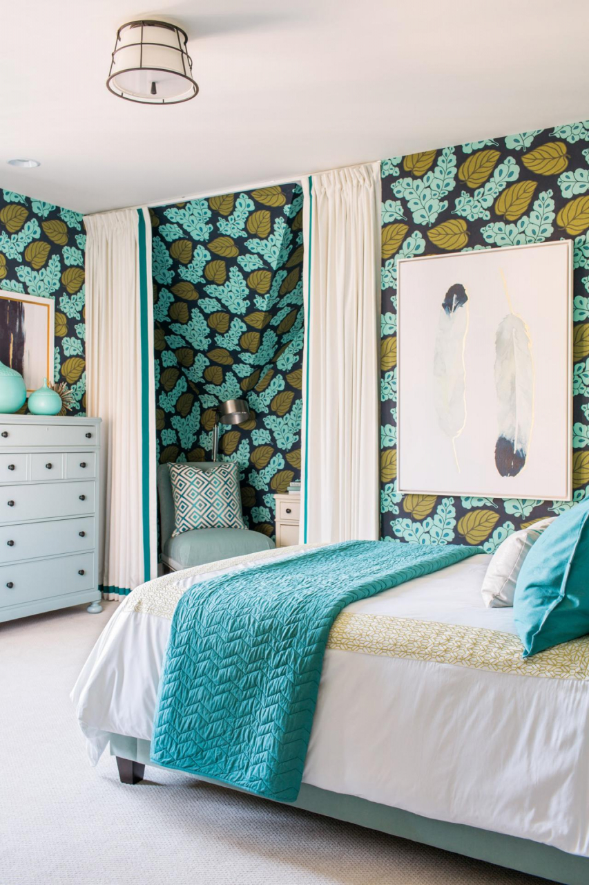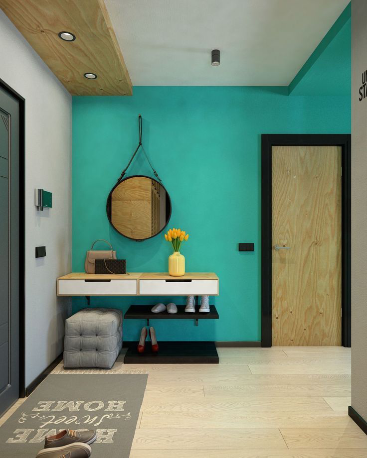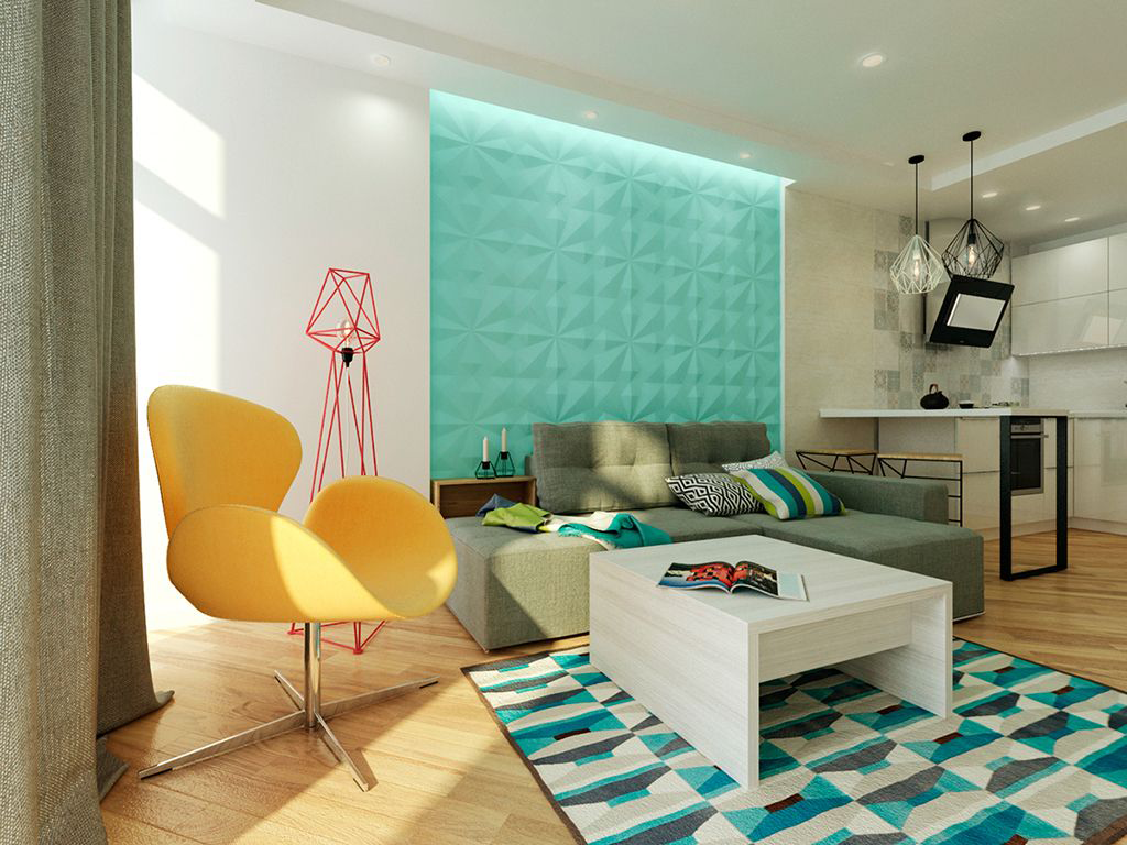 Uma tendência popular é a decoração de uma parede com uma decoração brilhante, que será original para se destacar contra o fundo geral do interior.. Ao mesmo tempo, as superfícies restantes são dispostas em tons neutros para não sobrecarregar o espaço. A cor turquesa parece bastante ativa. Para tornar o interior mais leve, combina-se com cores claras: areia, branco, cinza pérola, bege claro.