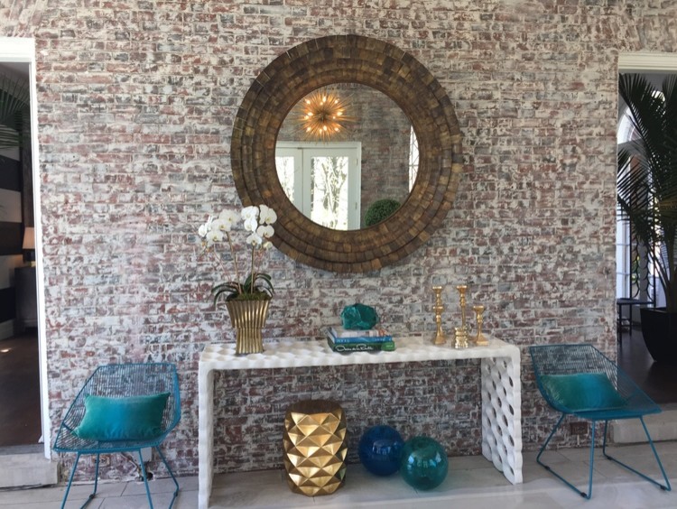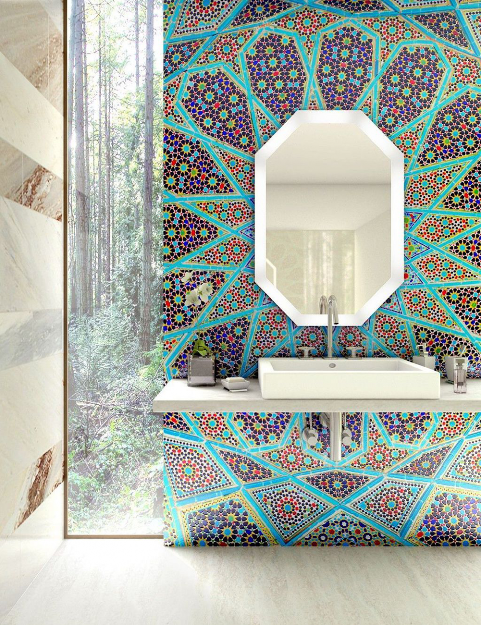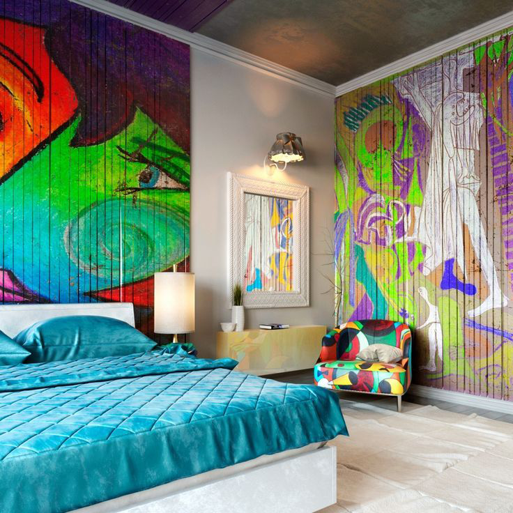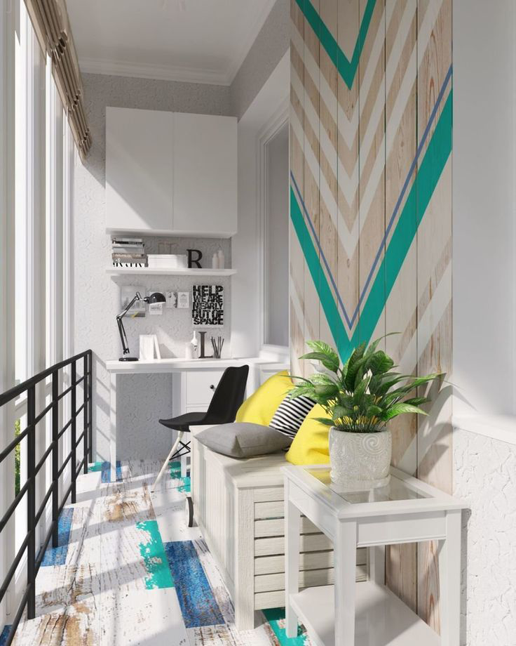 Uma tendência popular é a decoração de uma parede com uma decoração brilhante, que será original para se destacar contra o fundo geral do interior.. Ao mesmo tempo, as superfícies restantes são dispostas em tons neutros para não sobrecarregar o espaço. A cor turquesa parece bastante ativa. Para tornar o interior mais leve, combina-se com cores claras: areia, branco, cinza pérola, bege claro.