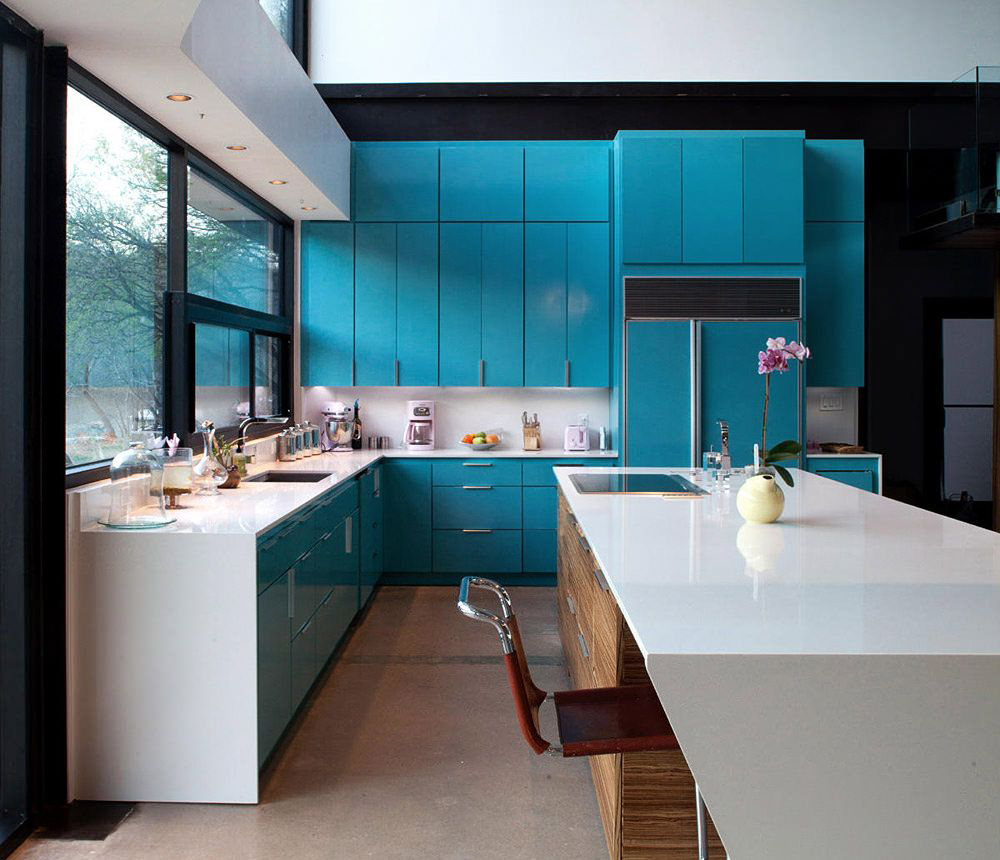 Qualquer turquesa na cozinha traz frescor e leveza ao ambiente. Diferentes texturas e materiais, do plástico à madeira natural, ficam bem contra o fundo.. Mas devemos lembrar o senso de proporção e entender o quanto a cor azul-verde é apropriada e com que cores combiná-la.