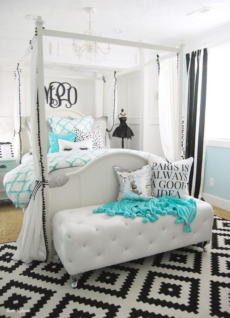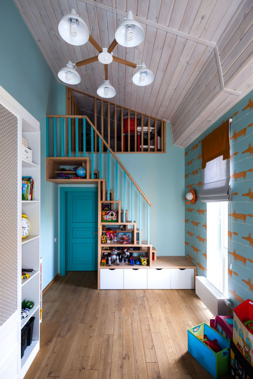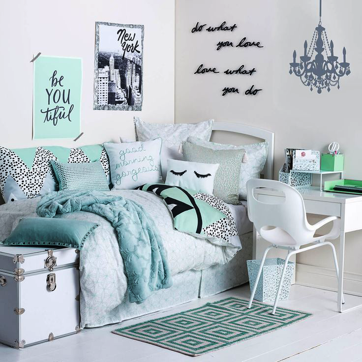 Nos quartos de adolescentes e crianças mais jovens, o branco pode se tornar a cor principal. Dilua a esterilidade do mobiliário azul-verde, têxteis e acessórios.