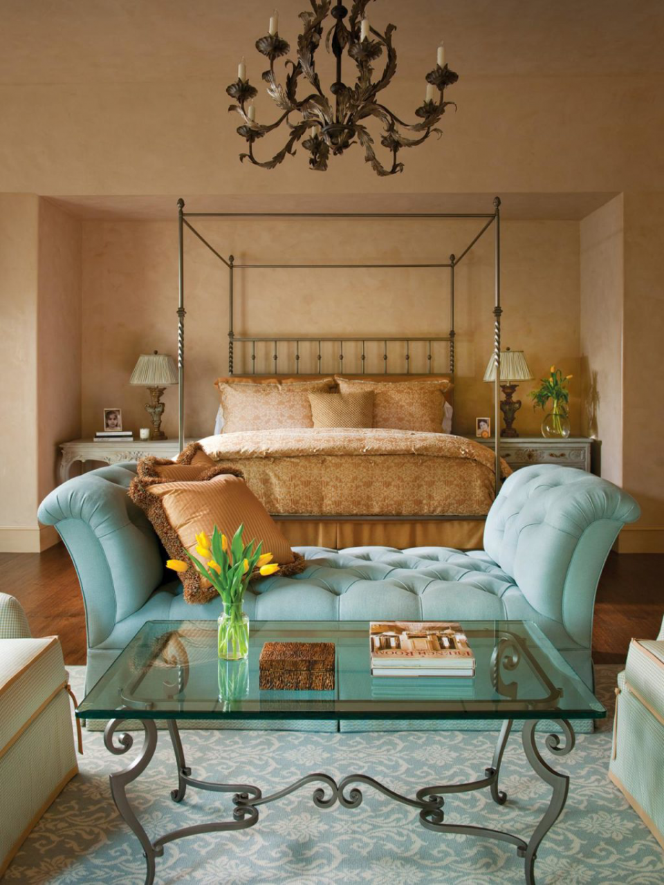 Paredes monofônicas de tom turquesa claro, móveis de wengué ou cor pau-rosa, cortinas estreitas de sombra de cacau, acessórios de escala amarelo-clara (abajures, tecidos, molduras) parecem elegantes e aristocráticas. Esta combinação de cores é adequada para decorar o quarto em estilo clássico. Várias almofadas de prata decorativas serão acentos brilhantes.