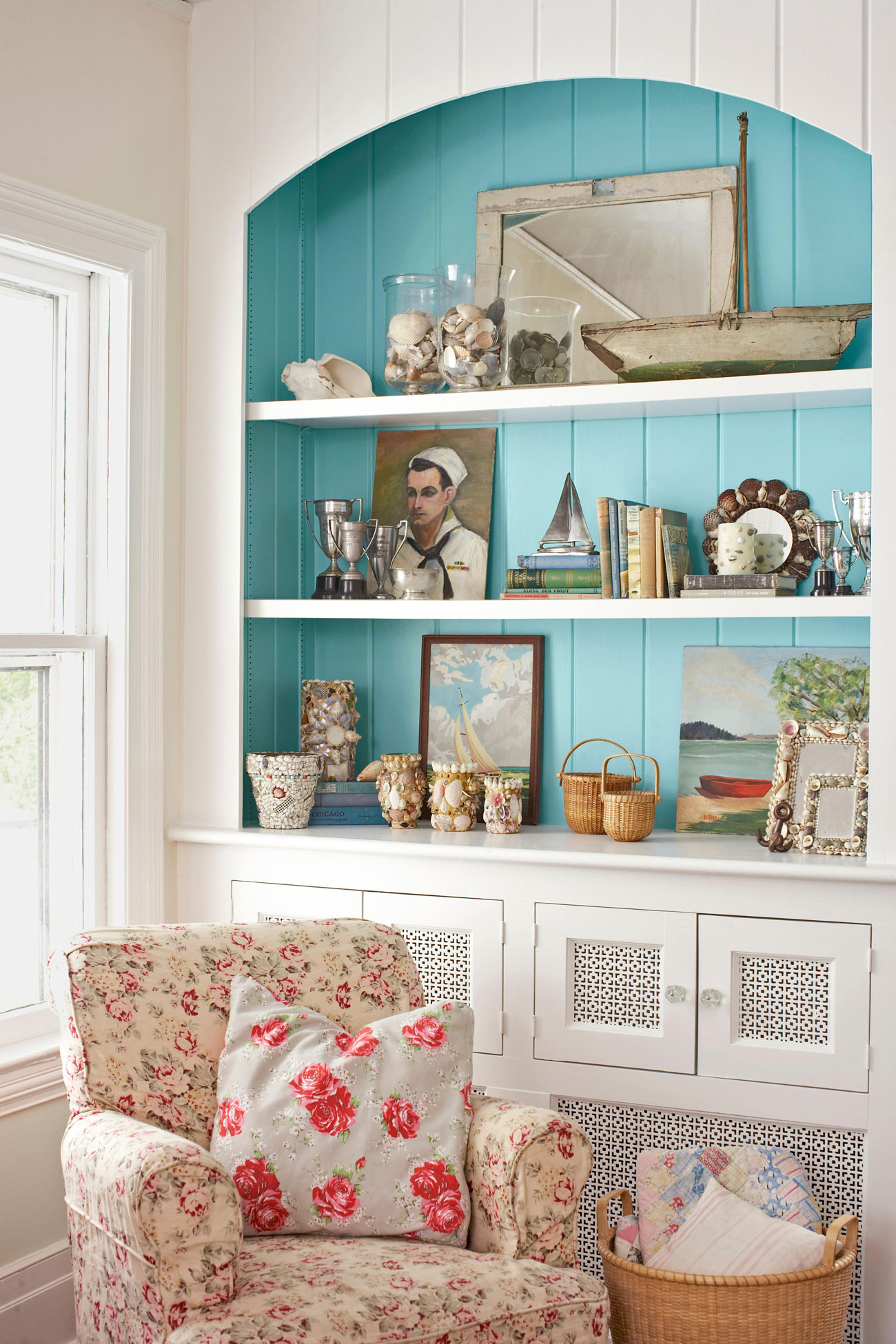 Se as janelas estiverem voltadas para o sul, qualquer sombra de azul-verde contribuirá para a atmosfera de refinamento e refinamento. Quando todas as superfícies são feitas na mesma cor, é aconselhável escolher cores pastel para decorar.