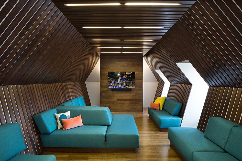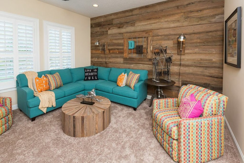 Decoração em forma de natural madeira ou materiais que imitam madeira irão adicionar sofisticação e luxo ao ambiente. E a madeira pode pegar uma grande variedade de cores. O método mais comum de combinação - piso de madeira e paredes turquesa. Às vezes, em quartos espaçosos, a decoração da parede de madeira parece original. Em tal interior, o piso pode ser revestido com azulejos turquesa escuros.