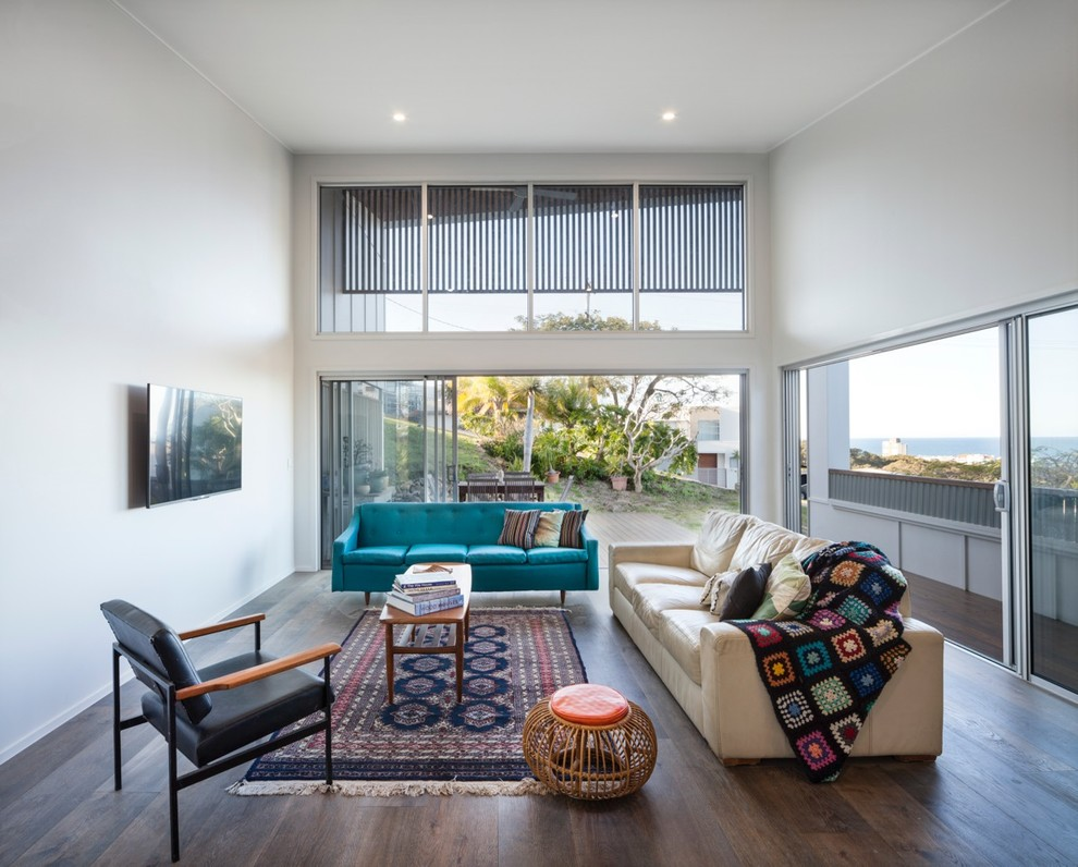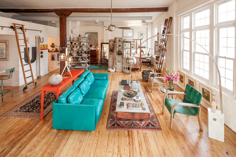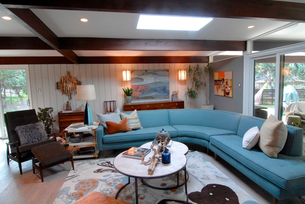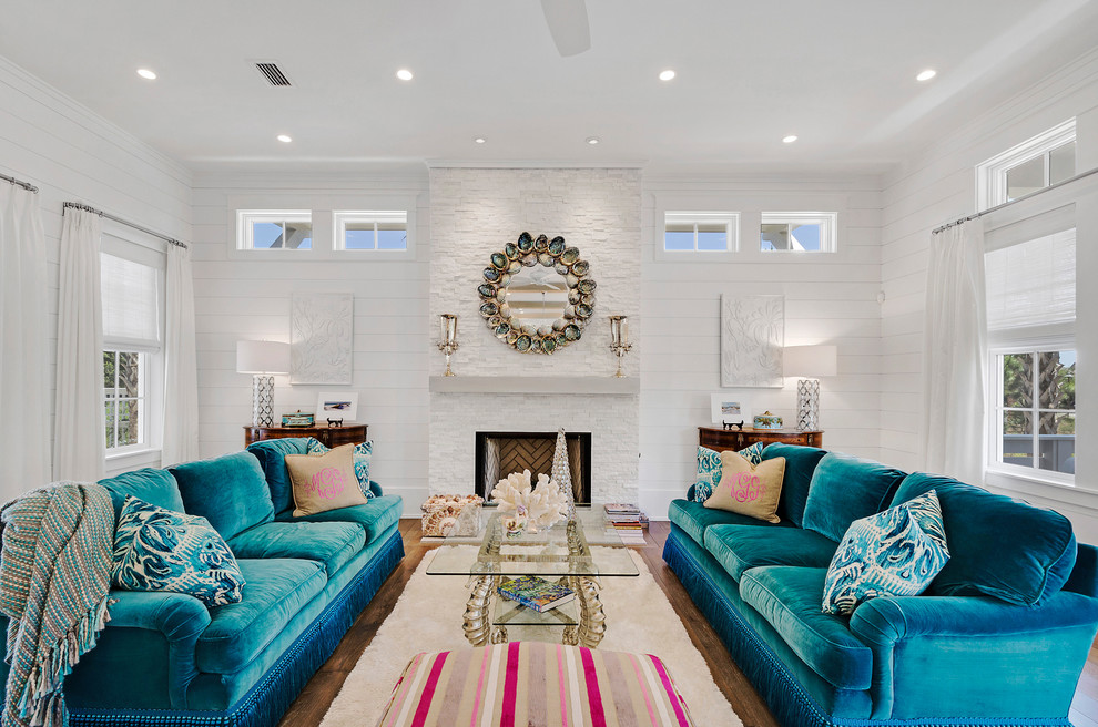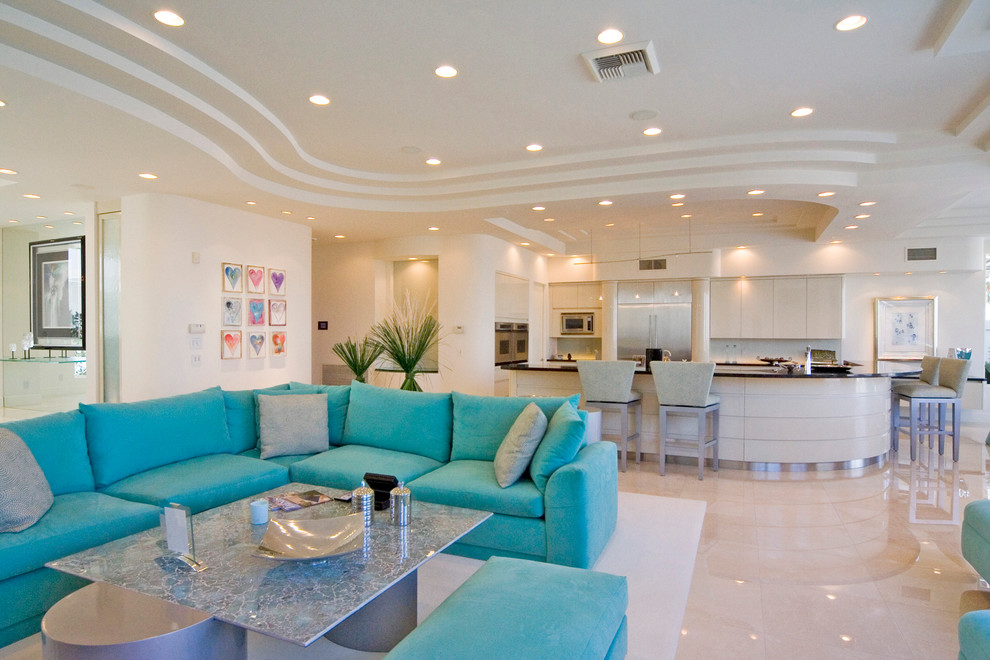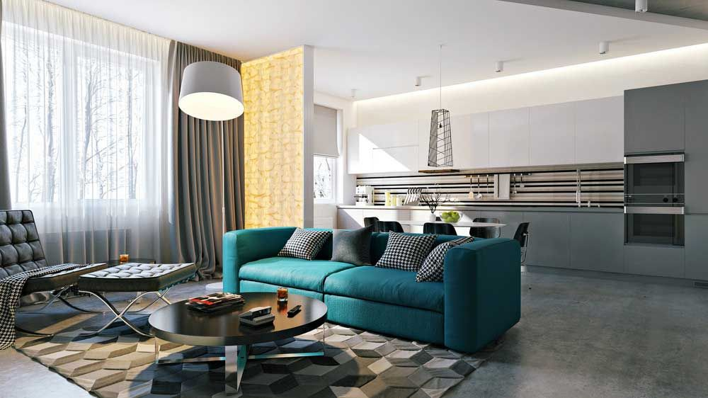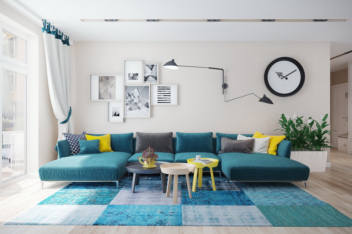O piso não deve se destacar na sala de estar azul-verde brilhante. Portanto, areia, cinza ou marrom claro parecerá bastante orgânico nos interiores de diferentes estilos. A combinação de piso branco e paredes turquesa é mais impressionante, mas a praticidade de tal escolha é duvidosa.