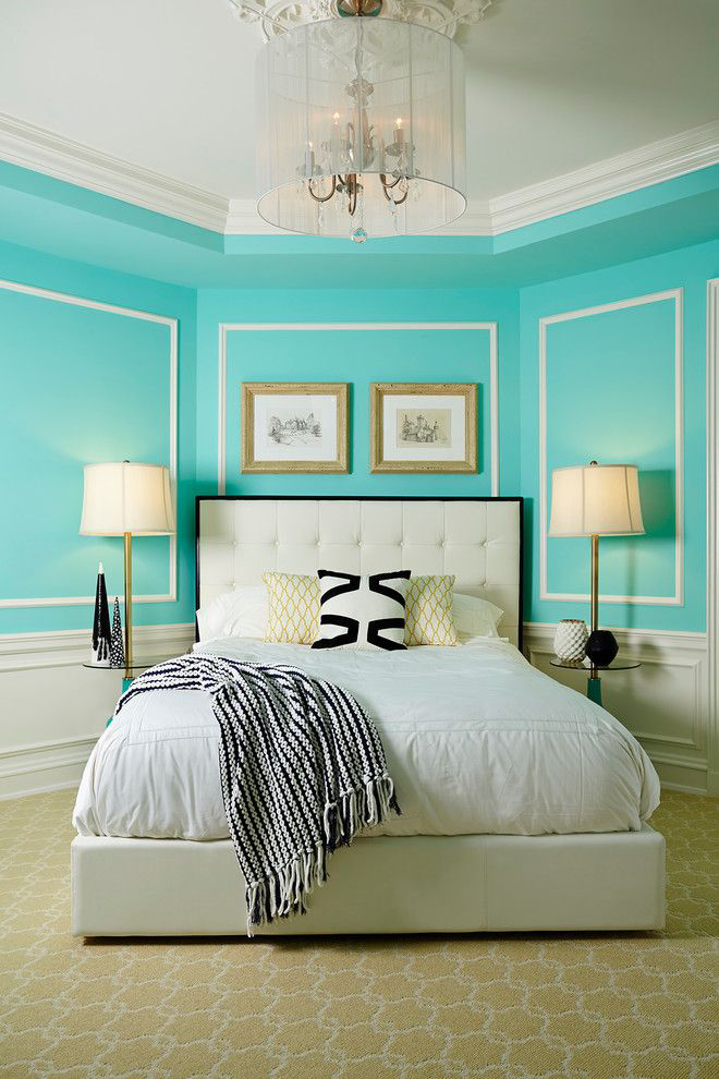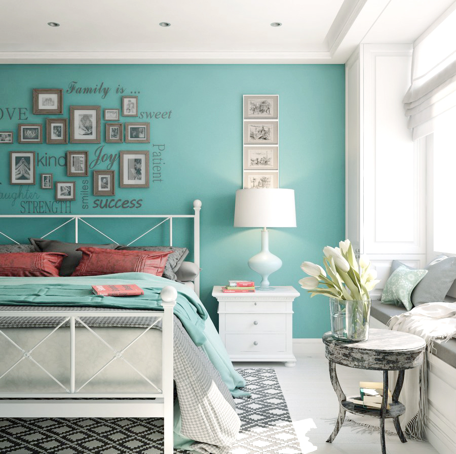 Essa paleta de luz suavemente diluirá a intensidade da turquesa. Na maioria das vezes no design das tintas interiores do quarto são utilizados: