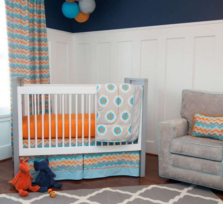 Combinações lacônicas de turquesa com cores marrom, azul, cinza e branco são adequadas para o quarto de um menino.