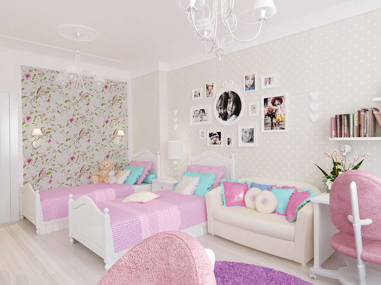 Tons rosa são adequados exclusivamente para o quarto da menina. Este é um dueto de cores muito caprichoso. Turquesa com um tom azulado parece organicamente com uma cor rosa avermelhada. E já para o terno rosa-turquesa esverdeado com tons de pêssego.