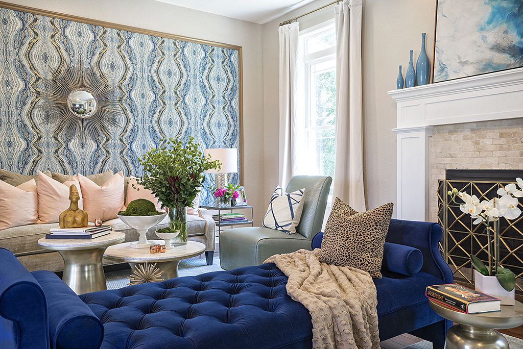 Solução não trivial será cobrir com um padrão, ornamento. Esta decoração de parede pode ser a decoração principal sala de estar. Os fabricantes produzem papel de parede com uma combinação harmoniosa de fundo e padrão. Para um interior clássico telas de cor azul-esverdeada pálida com um ornamento de ouro. FPapéis de parede brilhantes se encaixam no design de estilo moderno. Além disso, as linhas verticais visualmente tornam a sala mais alta.
