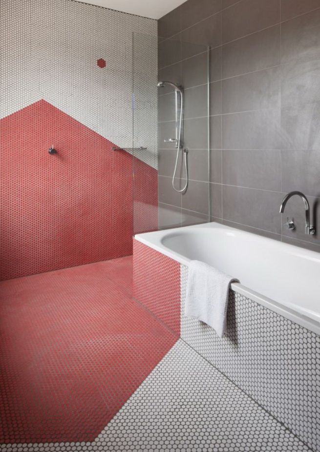 A telha cinza clara adiciona um conforto, enfatiza a limpeza. Uma opção vencedora é paredes cinzentas, azulejos brilhantes. Grandes desenhos de impressão em uma tendência, calma bem monocromática da cor principal.