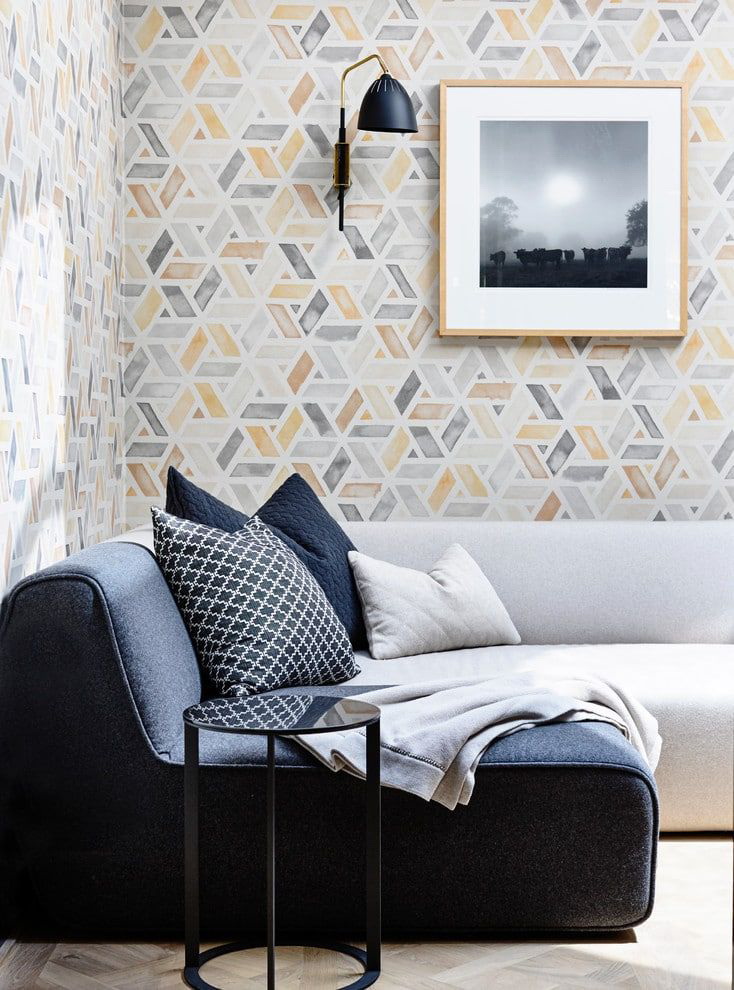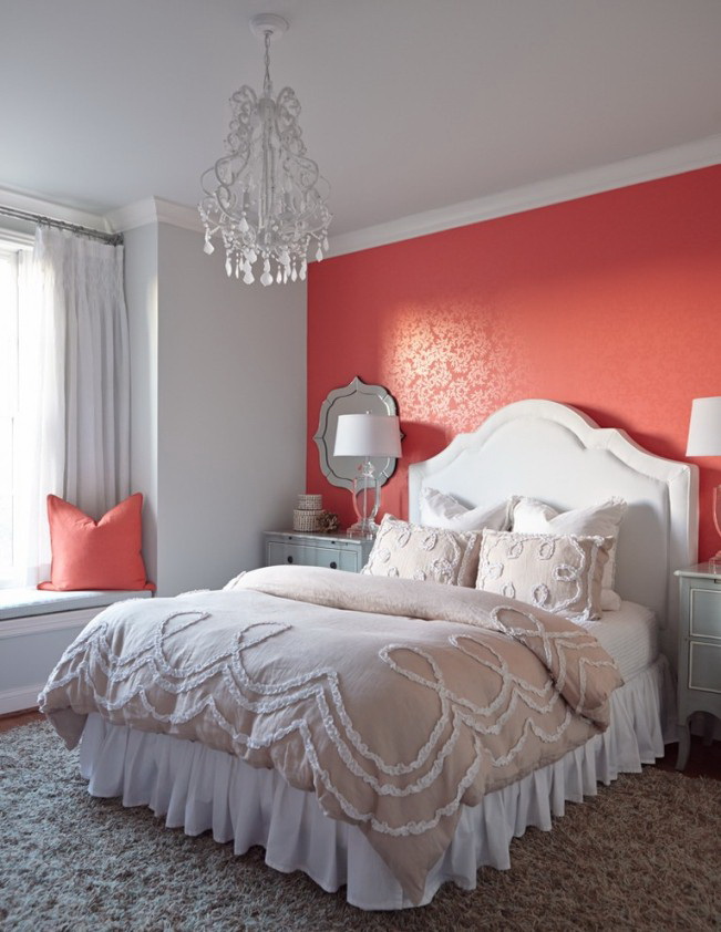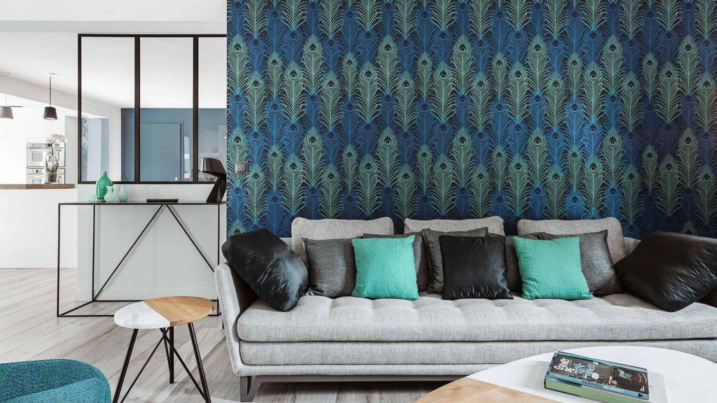 - Uma das paredes é decorada com um grande papel de parede estampado. Escolha um padrão na mesma cor e tons diferentes.