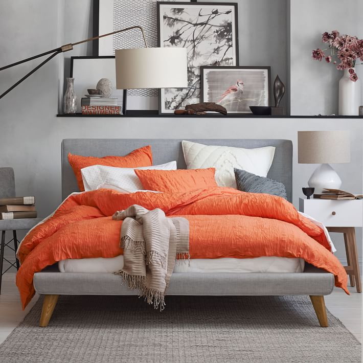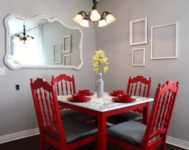 Cinza e vermelho é uma combinação incomum. Mas é bem adequado para quartos voltados para o norte e noroeste. Geralmente estes quartos não têm luz suficiente. Vermelho desempenha o papel de manchas de cores brilhantes e fornece calor. Está associado a interiores clássicos do estilo Império.