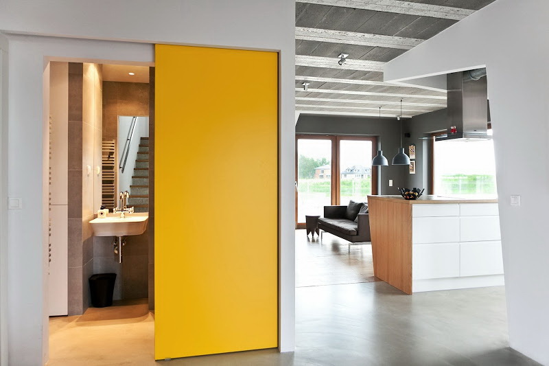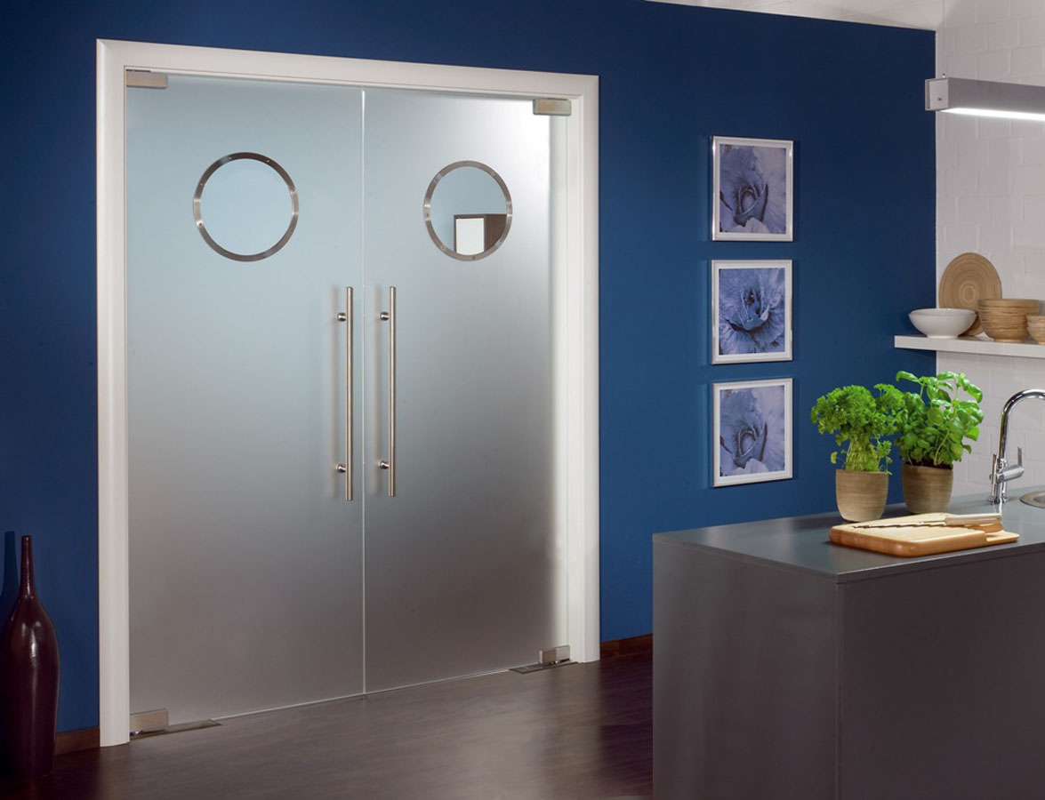 As portas se tornam o limite entre as duas salas. Escolha modelos em um estilo, caso contrário, o desconforto é garantido. Para criança, dormindo, casa de banho modelos com um pano surdo são preferíveis. Em salas de estar, cozinhas com caixilhos de portas de vidro texturizado e colorido parecem boas.