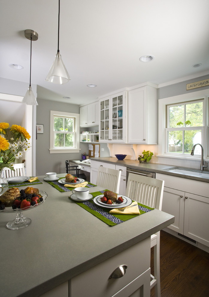 - paredes brancas e estofados de móveis cinza, cinza com branco carpeteantracite fachadas e bancadas móveis;