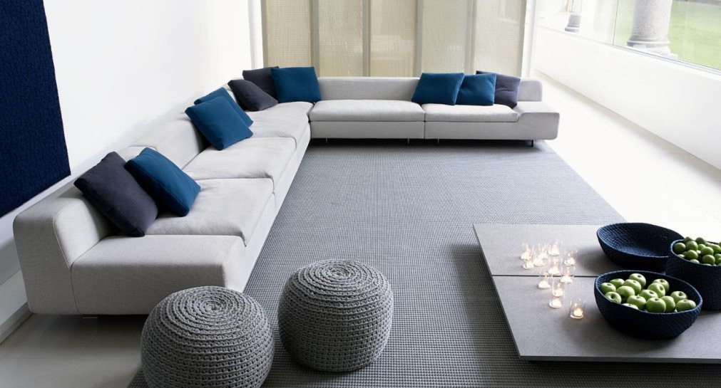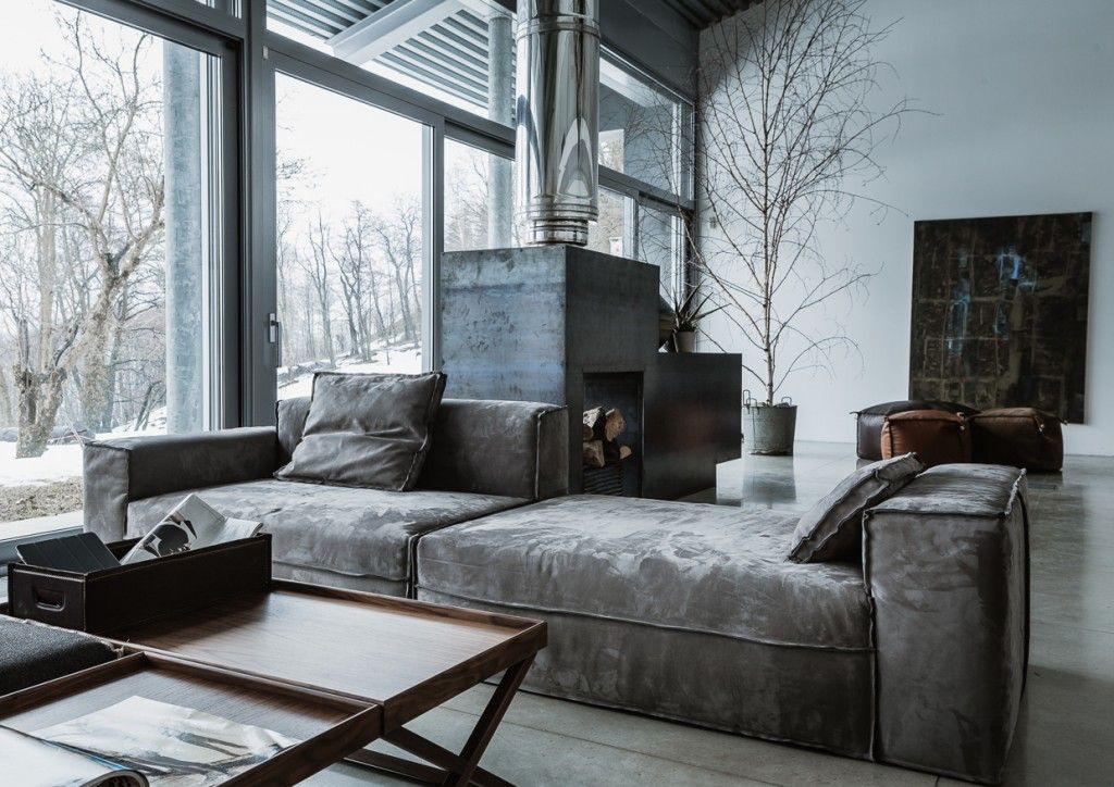 Para os amantes de experimentos em sala de estar Dois sofás estão instalados: um é cinza e o outro é branco, preto ou marrom. Variedade e exclusividade são garantidas.
