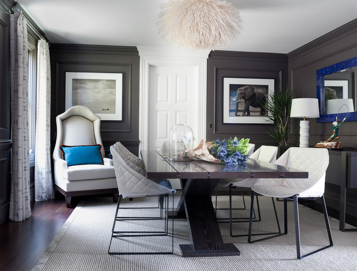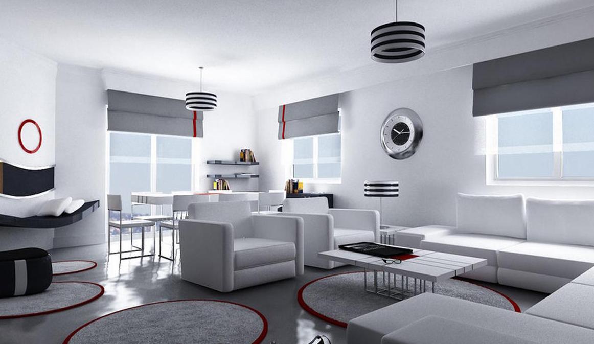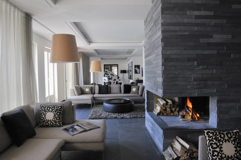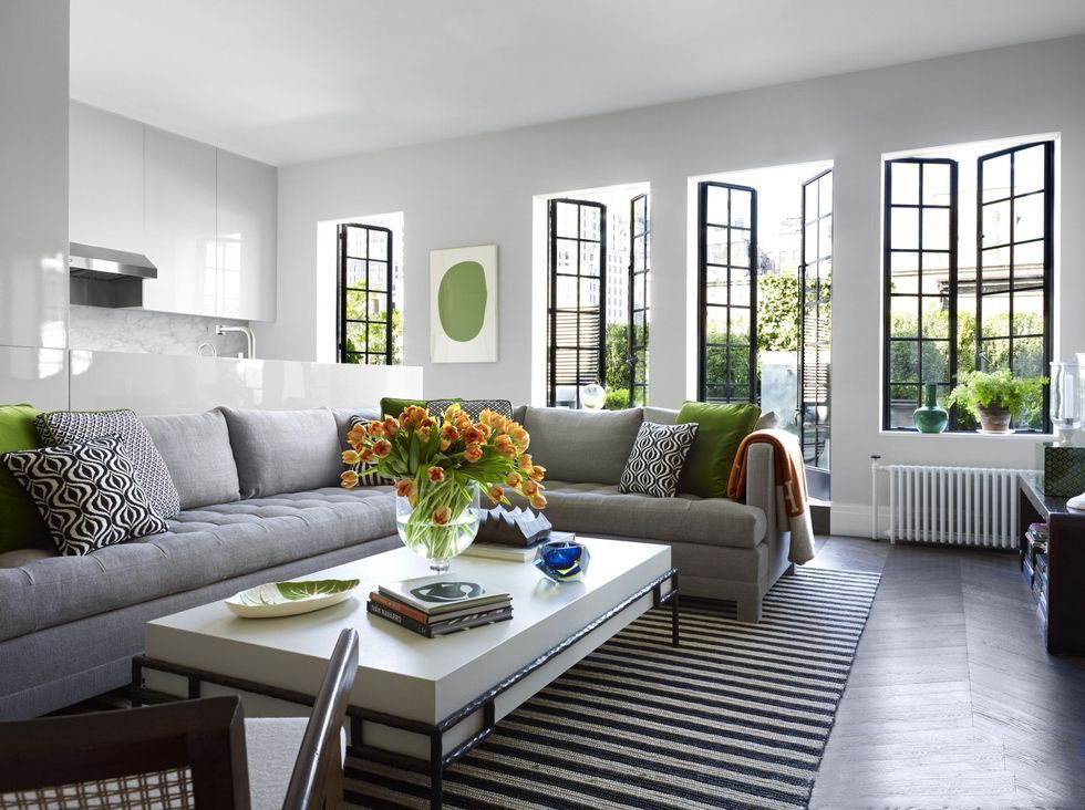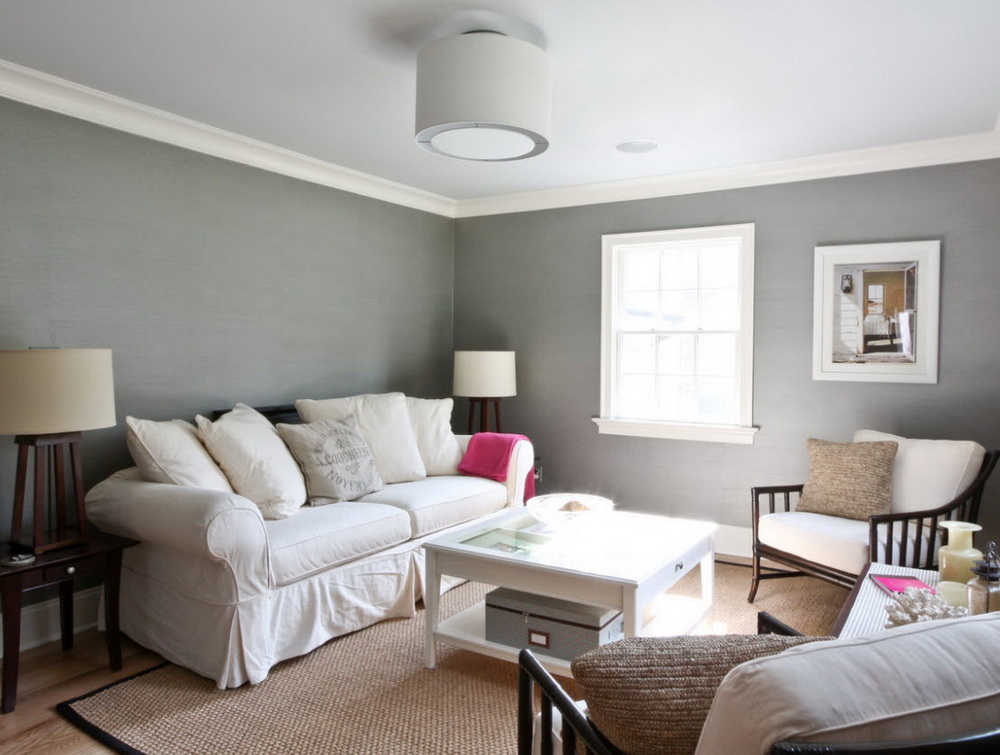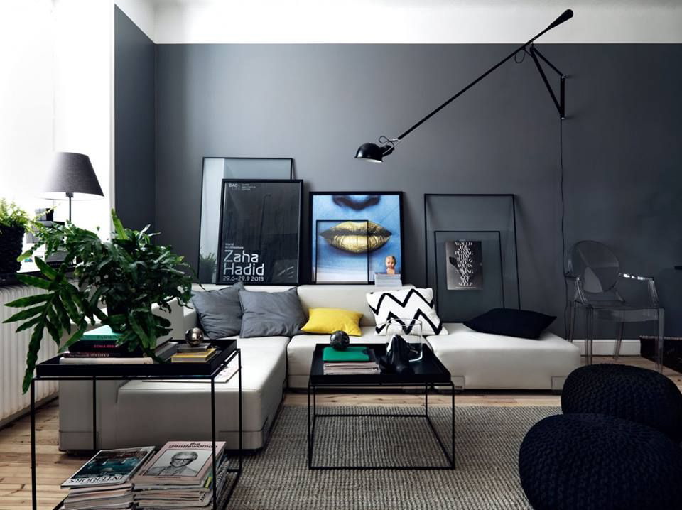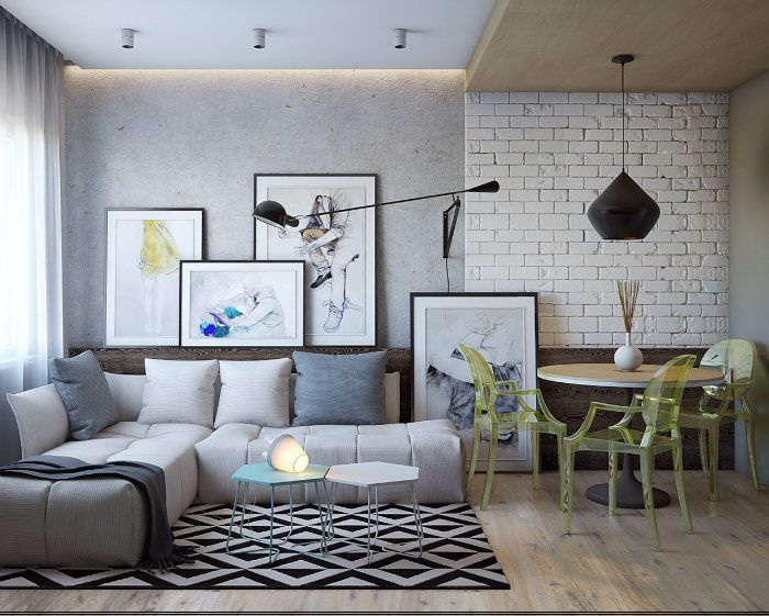 A cor branca dilui o tom de cinza principal, proporciona um aumento visual na sala. O uso fragmentado de grafite ou tons de antracito ajudará a diversificar o interior. Pode ser:
