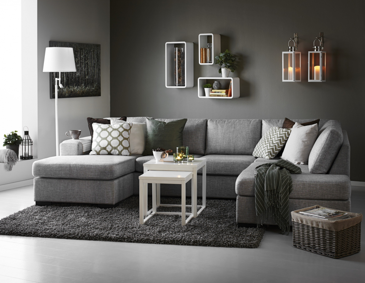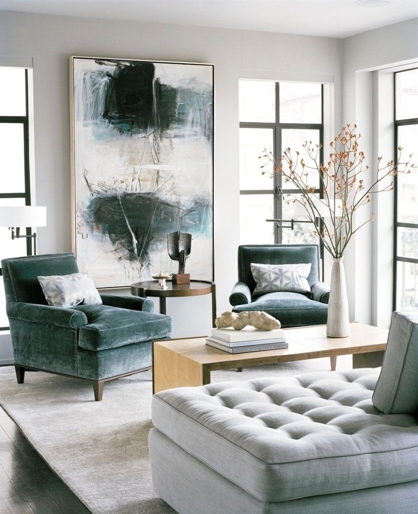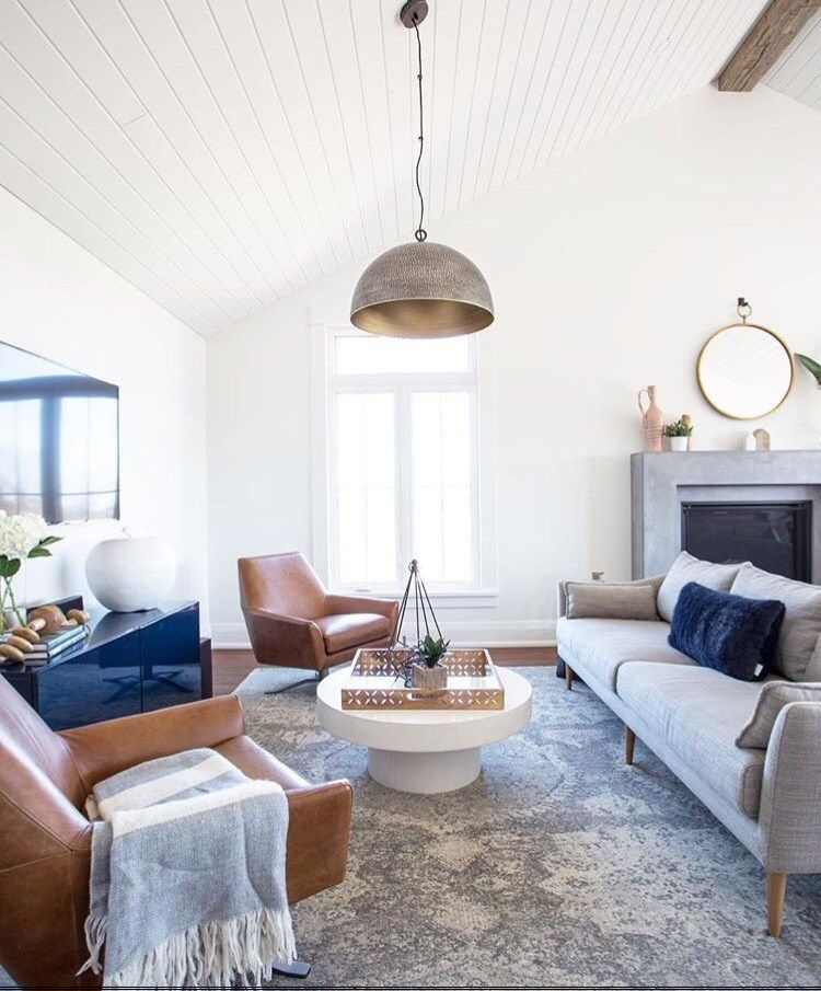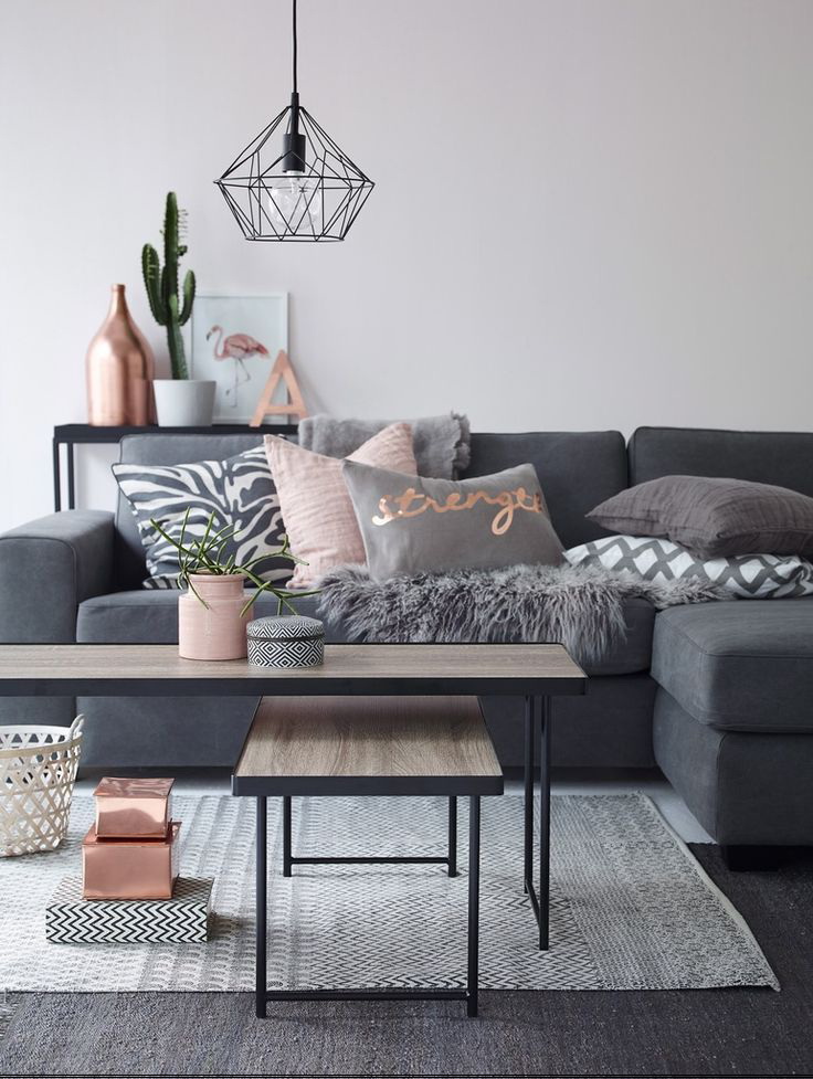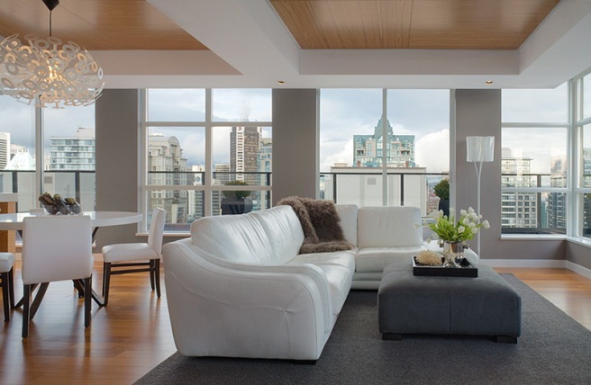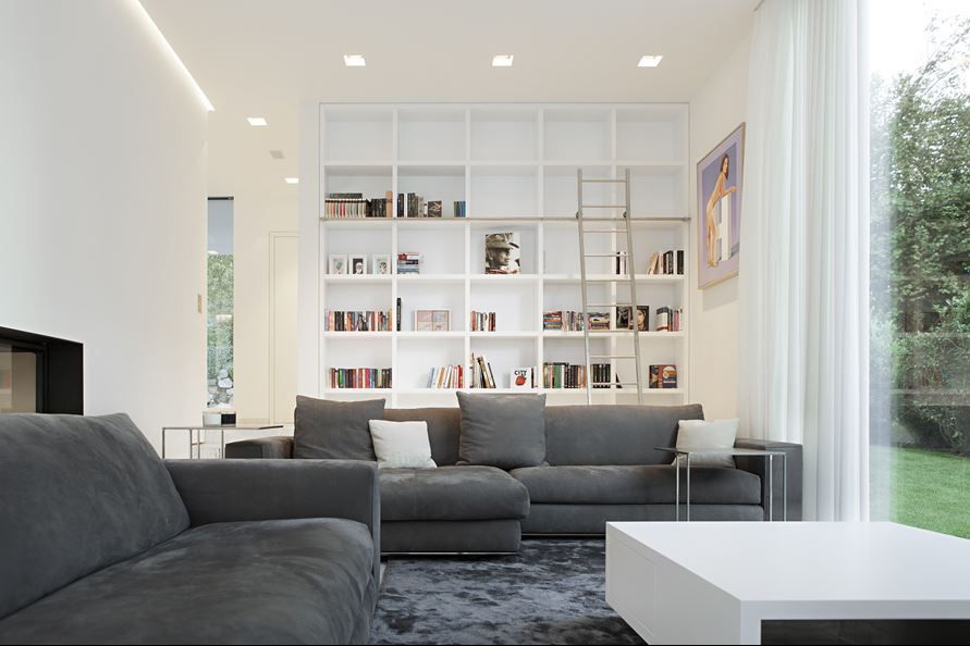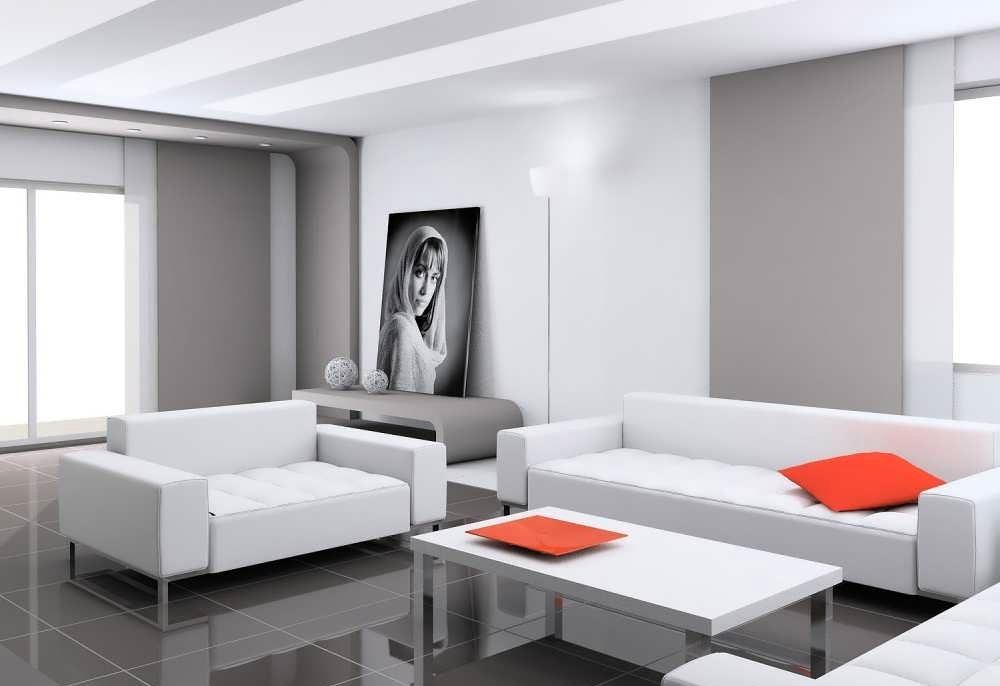 A cor branca dilui o tom de cinza principal, proporciona um aumento visual na sala. O uso fragmentado de grafite ou tons de antracito ajudará a diversificar o interior. Pode ser: