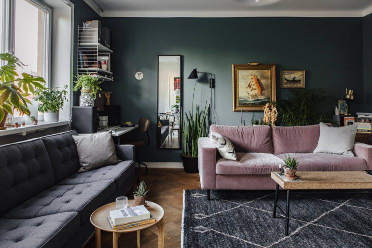 Assim, um oásis de paz é criado, mesmo em uma cidade barulhenta e barulhenta. Em salas compridas, pinte paredes curtas com um tom mais escuro que as longas e você verá que a sala mudou e adquiriu visualmente outros parâmetros.