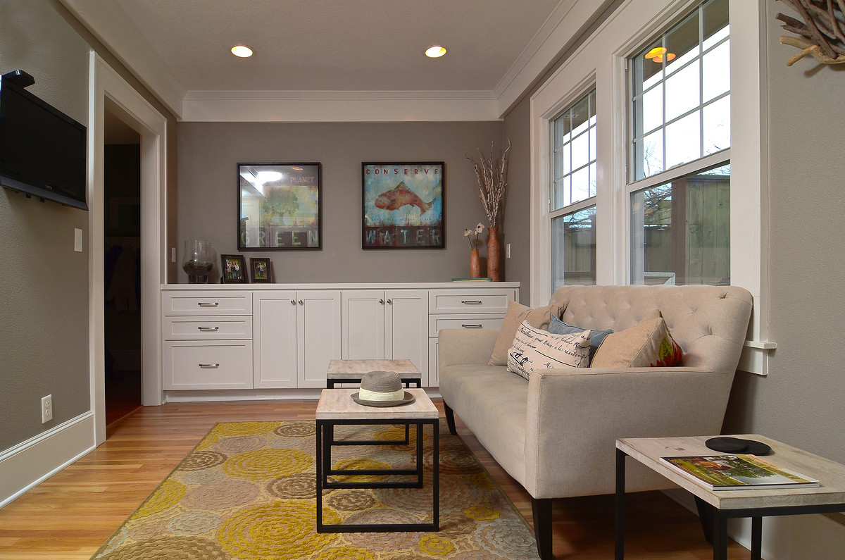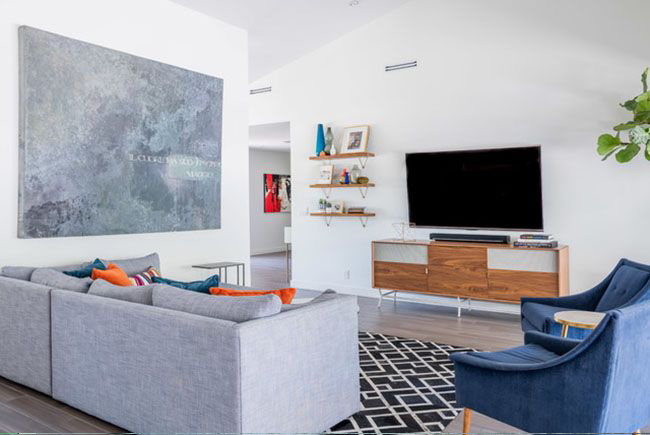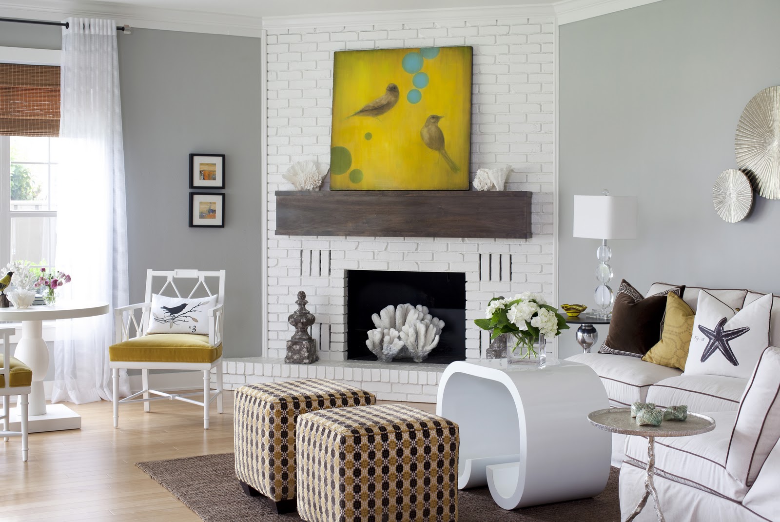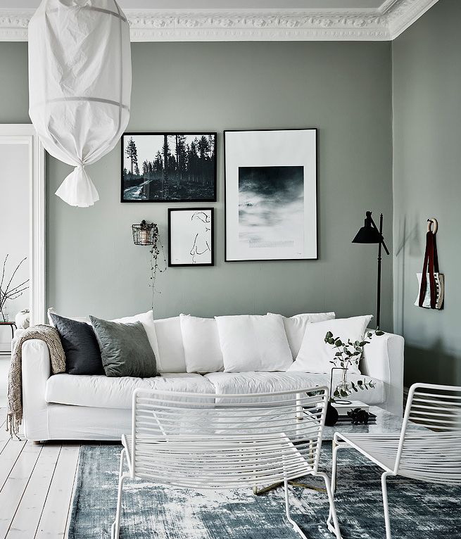 - Uma das paredes é decorada com branco, e torna-se o pano de fundo para pinturas, vasos de chão, móveis estofados e prateleiras decorativas. Os três restantes são cinzentos.