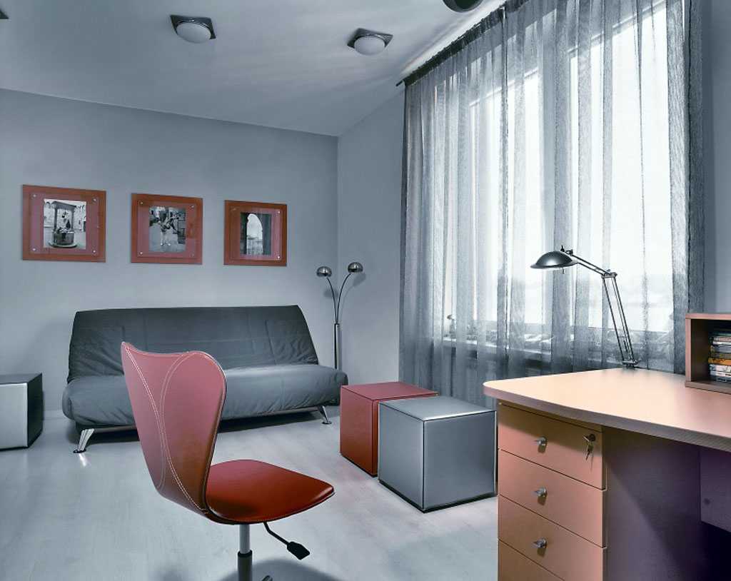 O cinza é indispensável nos escritórios. Atmosfera de negócios será fornecida. Se você combinar cinza com marrom, a sala terá um visual festivo. Escolha tons de aço esfumaçados que proporcionam uma sensação de maturidade.