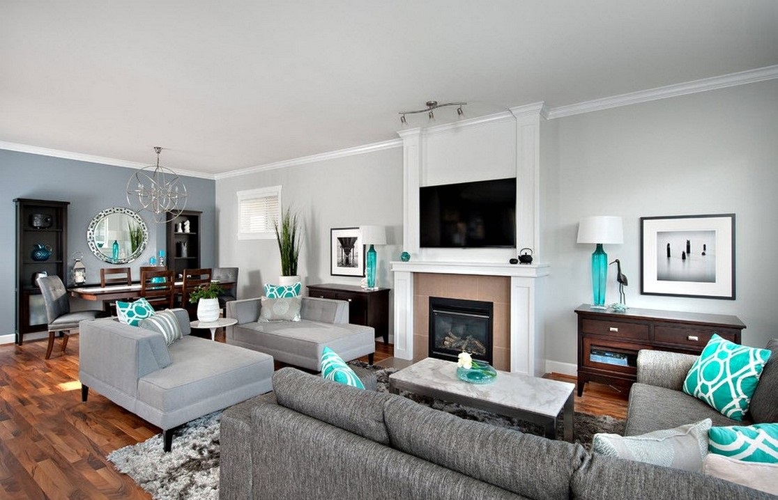 Gray notavelmente se dá bem com o azul, semelhante a azul e turquesa. Nos quartos e salas de estar, o tom pérola da decoração e os móveis e tecidos azuis proporcionam elegância clássica. Essas cores e tons se entrelaçam, se complementam.