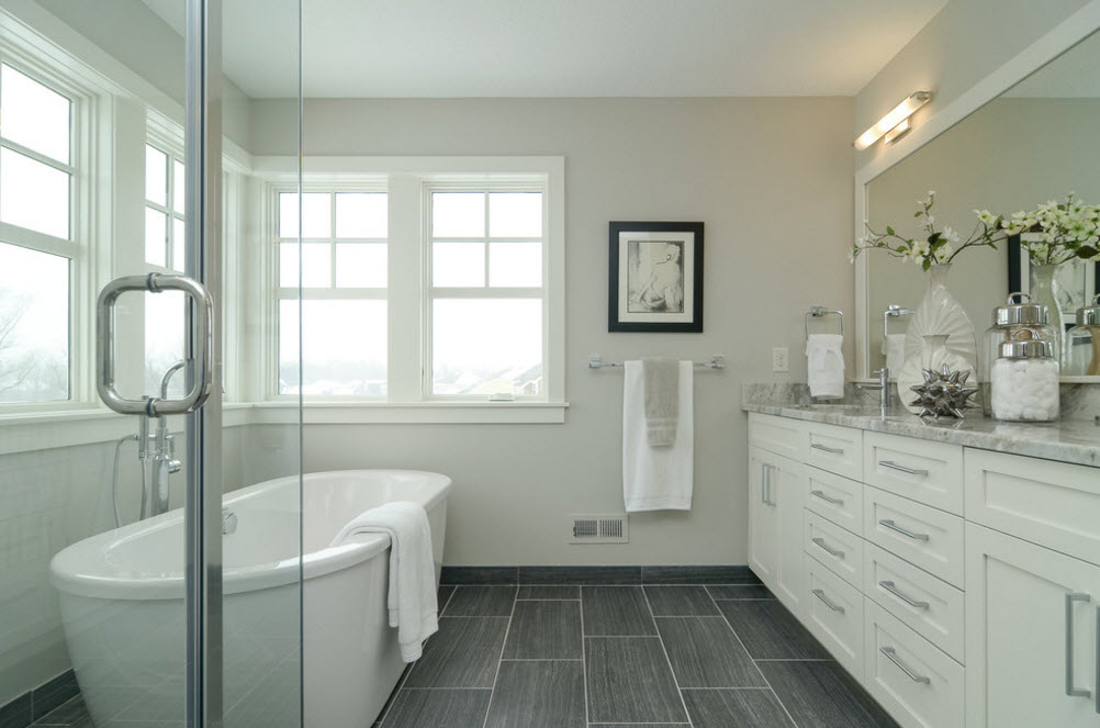 Escolha uma telha grande para um piso com uma superfície áspera e brilhante para paredes. O padrão de tile deve ser o mesmo ou no mesmo estilo. Os pisos são um pouco mais escuros que as paredes. Algumas coleções oferecem essas opções. Como resultado, a combinação de superfícies cinzentas, acessórios de encanamento branco, lâmpadas, espelhos tornam o quarto grande e elegante.